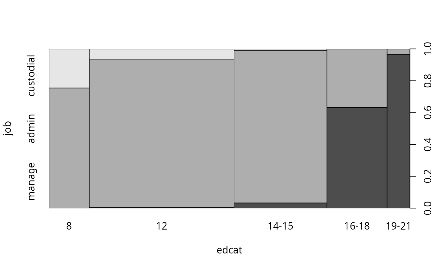 tab <- xtabs(~ edcat + job, data = BankWages)