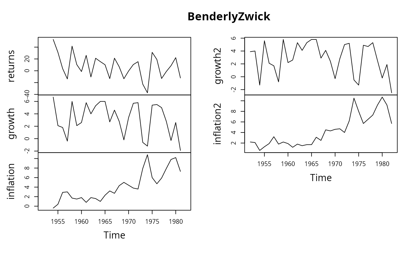 #> dynlm(formula = returns ~ growth + inflation, data = BenderlyZwick,