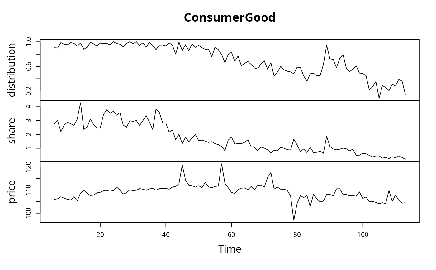 ConsumerGood.RdTime series of distribution, market share and price of a fast-moving consumer good.