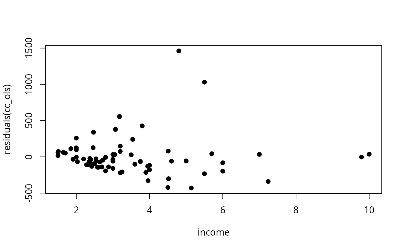 plot(residuals(cc_ols) ~ income, data = ccard0, pch = 19)