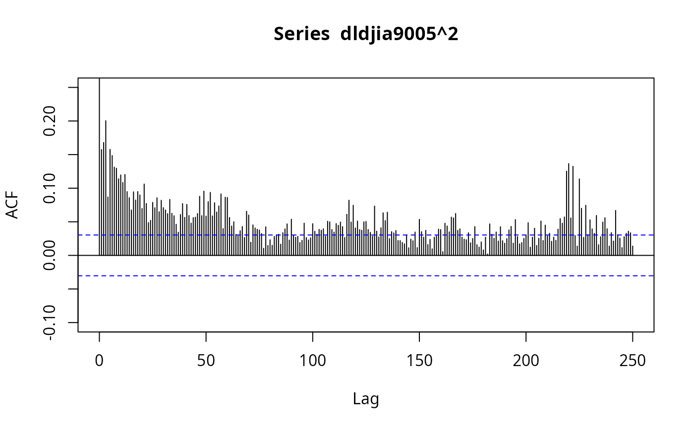 acf(dldjia9005^2, na.action = na.exclude, lag.max = 250, ylim = c(-0.1, 0.25))