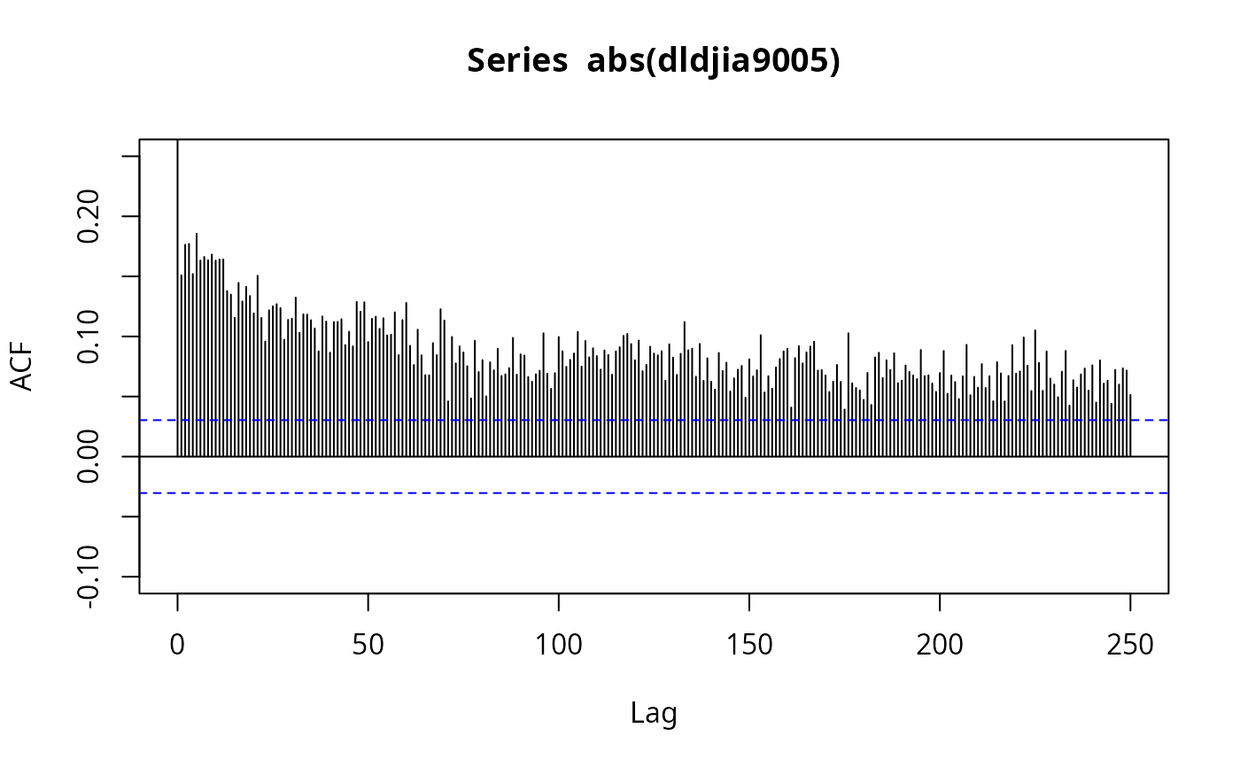 acf(abs(dldjia9005), na.action = na.exclude, lag.max = 250, ylim = c(-0.1, 0.25))