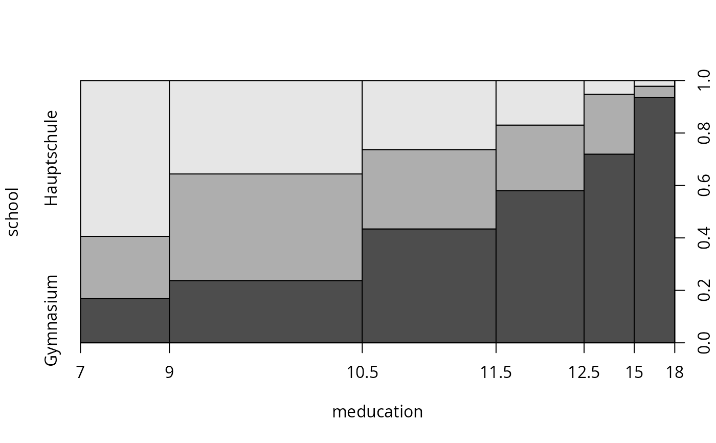 plot(school ~ meducation, data = gsoep, breaks = c(7, 9, 10.5, 11.5, 12.5, 15, 18))