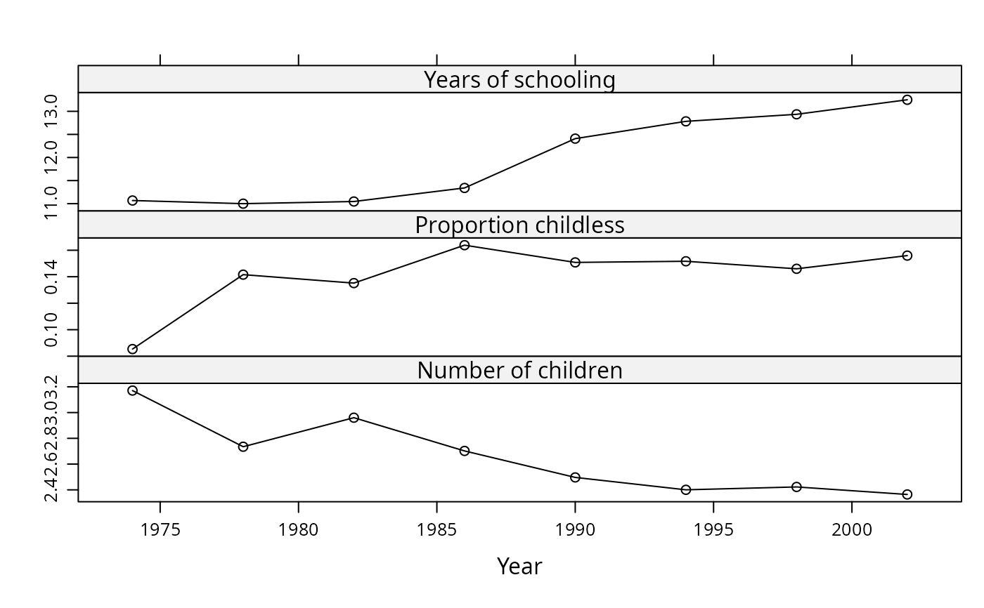 GSS7402.RdCross-section data for 9120 women taken from every fourth year of the US General Social Survey between 1974 and 2002 to investigate the determinants of fertility.