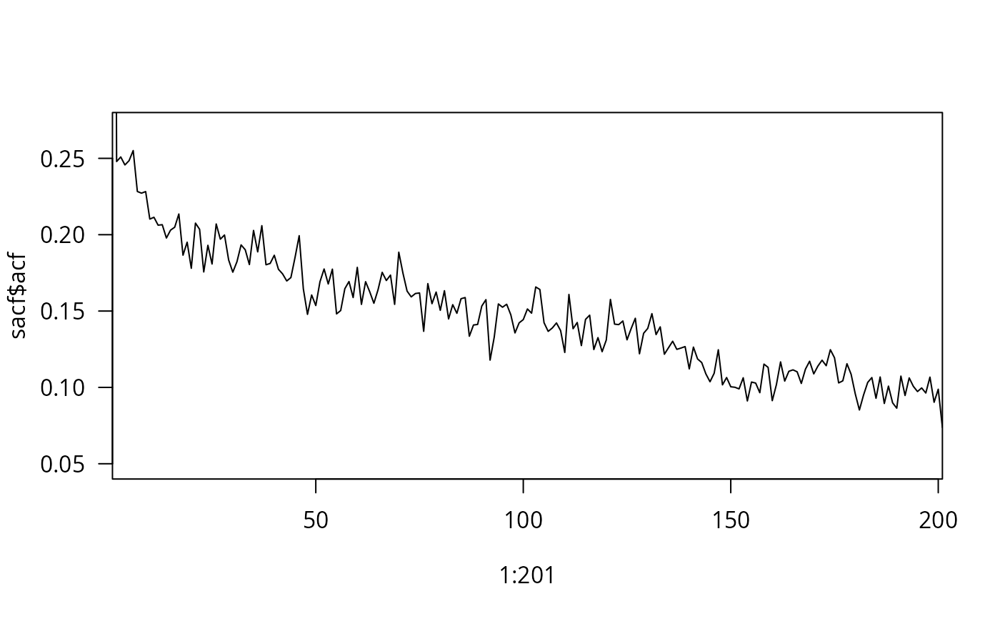 sacf <- acf(absgret, lag.max = 200, na.action = na.exclude, plot = FALSE)