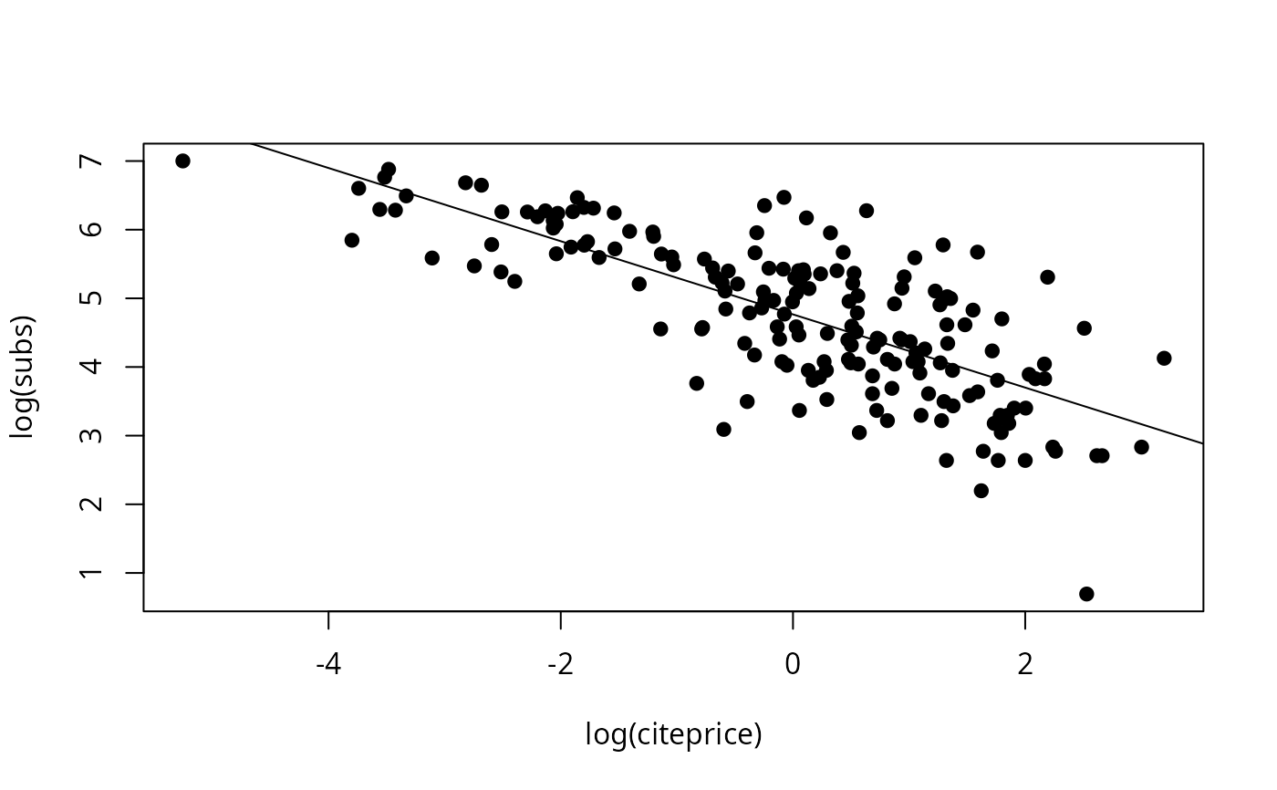 fm1 <- lm(log(subs) ~ log(citeprice), data = journals)