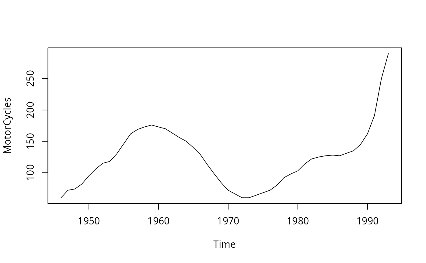MotorCycles.RdTime series of stock of motor cycles (two wheels) in The Netherlands (in thousands).
