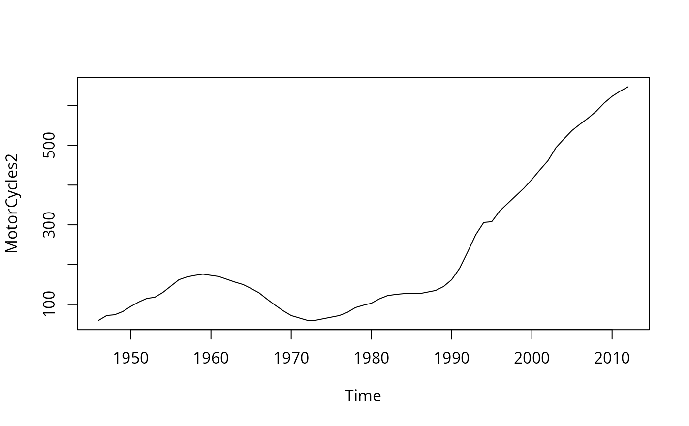MotorCycles2.RdTime series of stock of motor cycles (two wheels) in The Netherlands (in thousands).