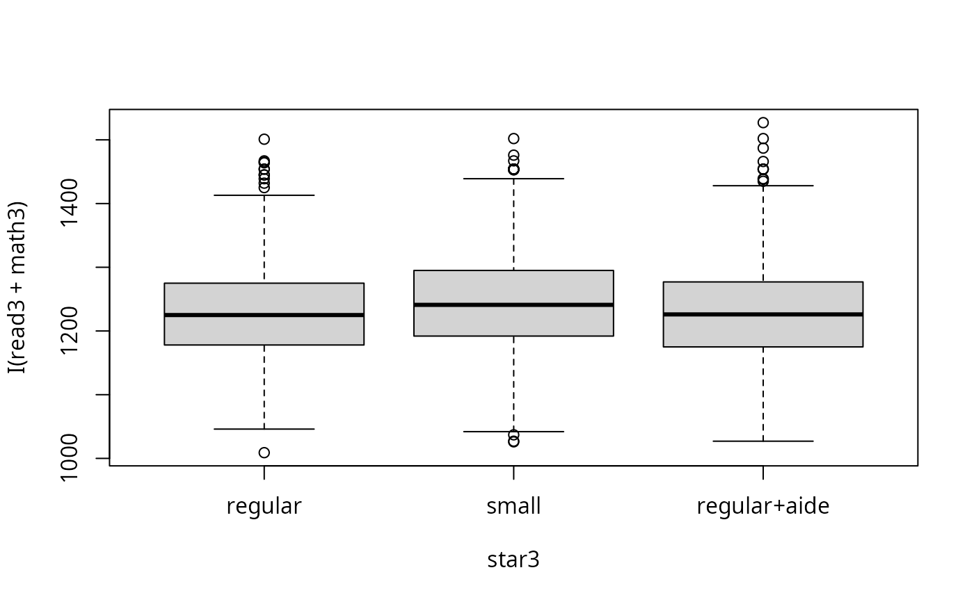 fm3 <- lm(I(read3 + math3) ~ star3, data = STAR)