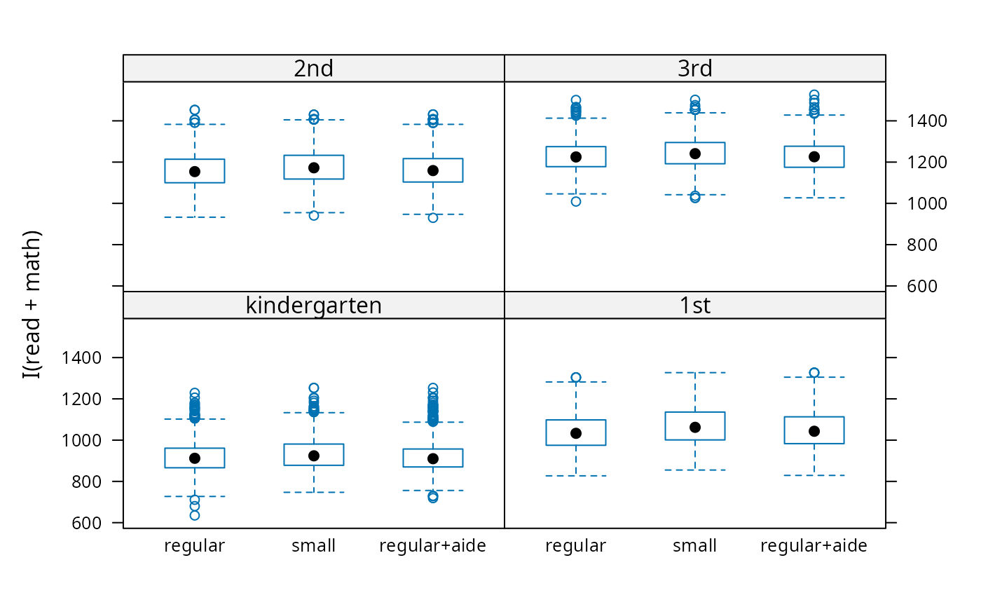 bwplot(I(read + math) ~ star | grade, data = star)