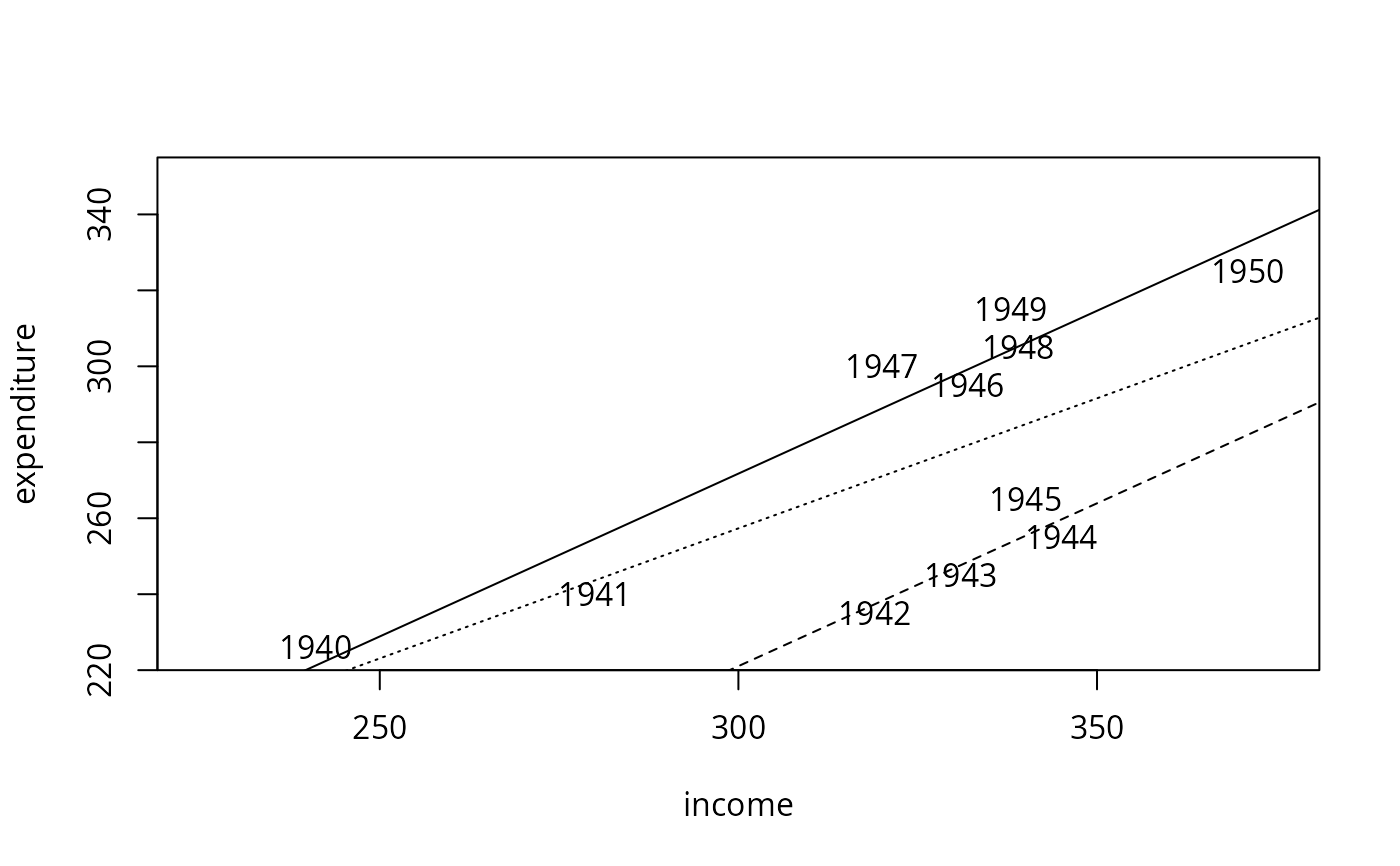 with(usc, text(income, expenditure, time(USConsump1950)))