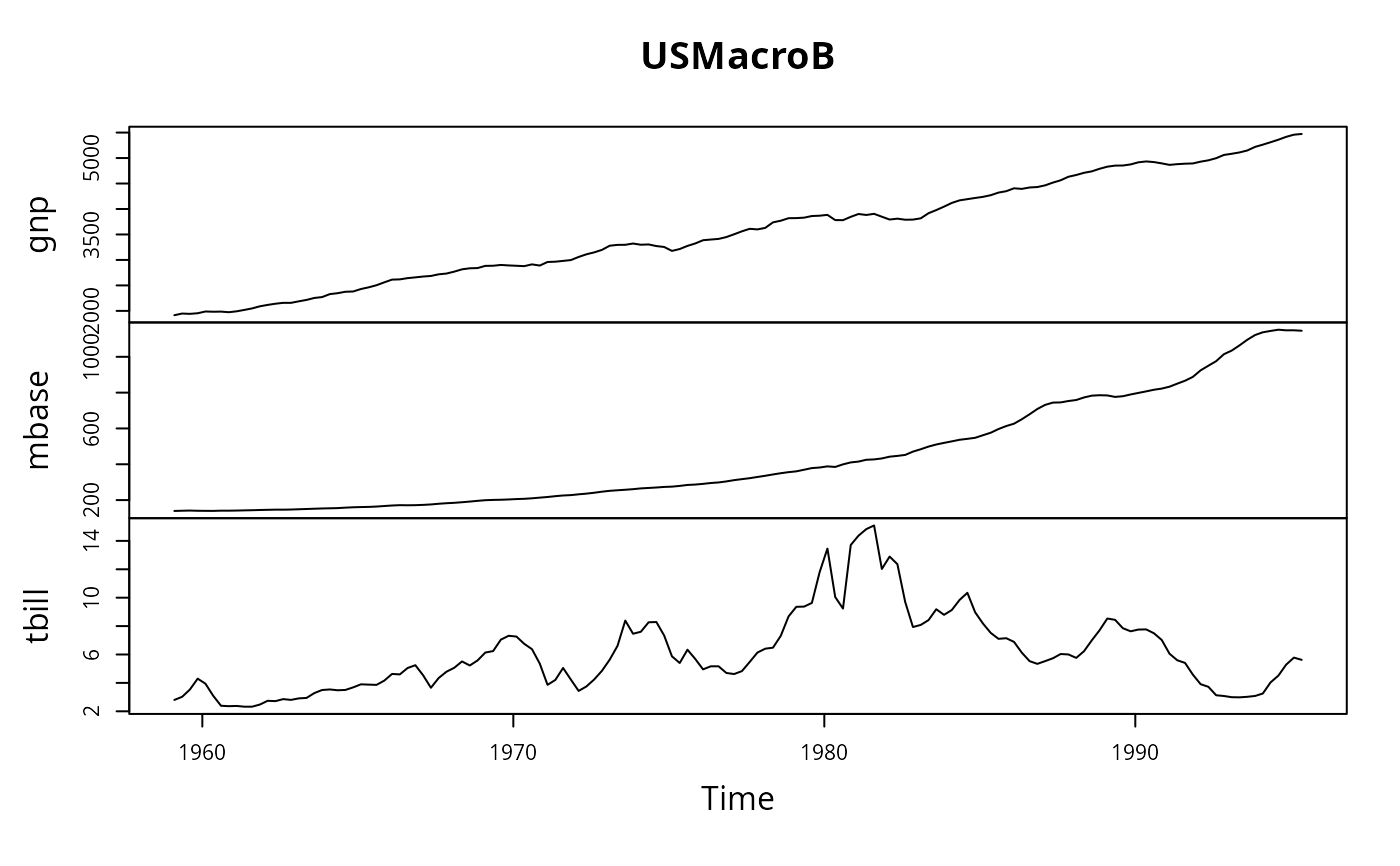 USMacroB.RdTime series data on 3 US macroeconomic variables for 1959–1995, extracted from the Citibank data base.
