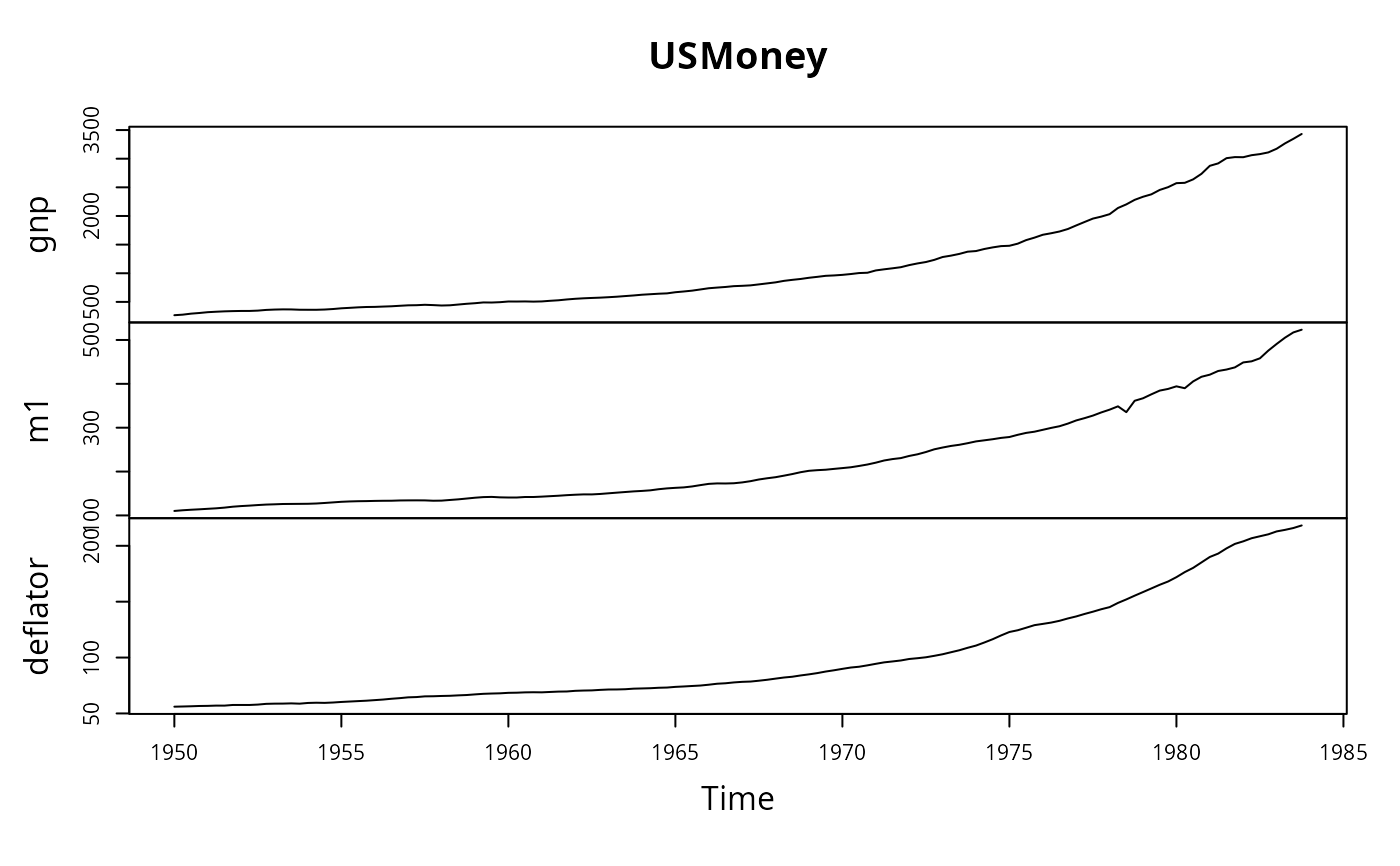USMoney.RdMoney, output and price deflator time series data, 1950–1983.