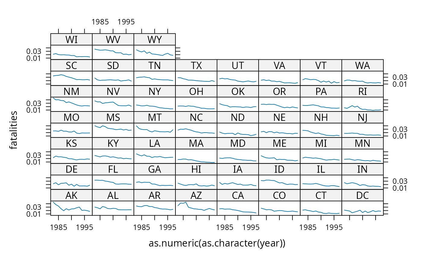 xyplot(fatalities ~ as.numeric(as.character(year)) | state, data = USSeatBelts, type = "l")