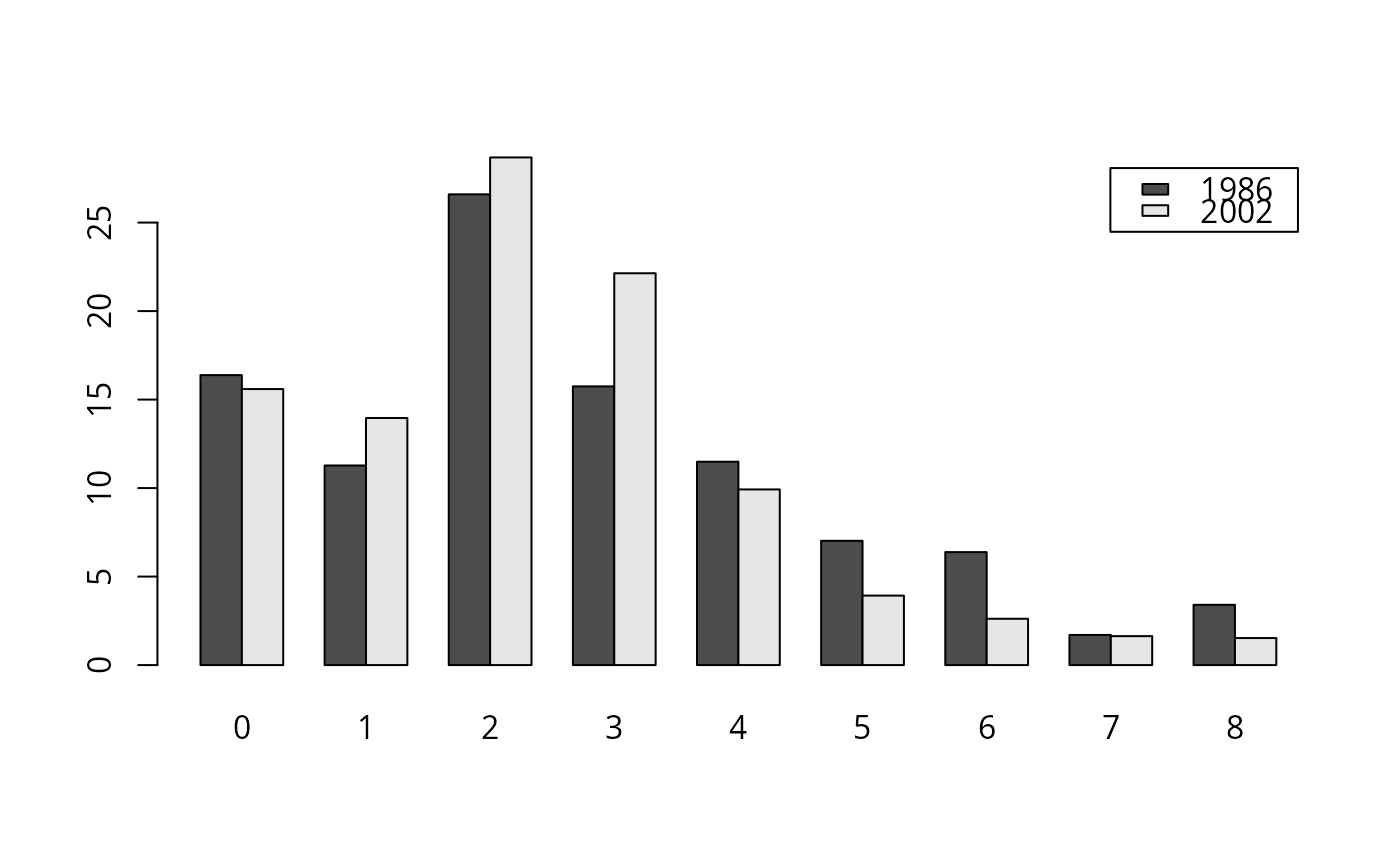 kids_tab <- prop.table(xtabs(~ kids + year, data = gss40), 2) * 100