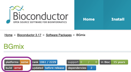 A small number of Bioconductor packages are not available on all operating systems. An orange ‘platforms’ badge indicates this. Click on the badge to be taken to the ‘Package Archives’ section of the landing page; BGmix is not supported on Windows, and not available on ‘Intel’ macOS because of build-related errors. Consider using an alternative operating system if the package is essential to your work