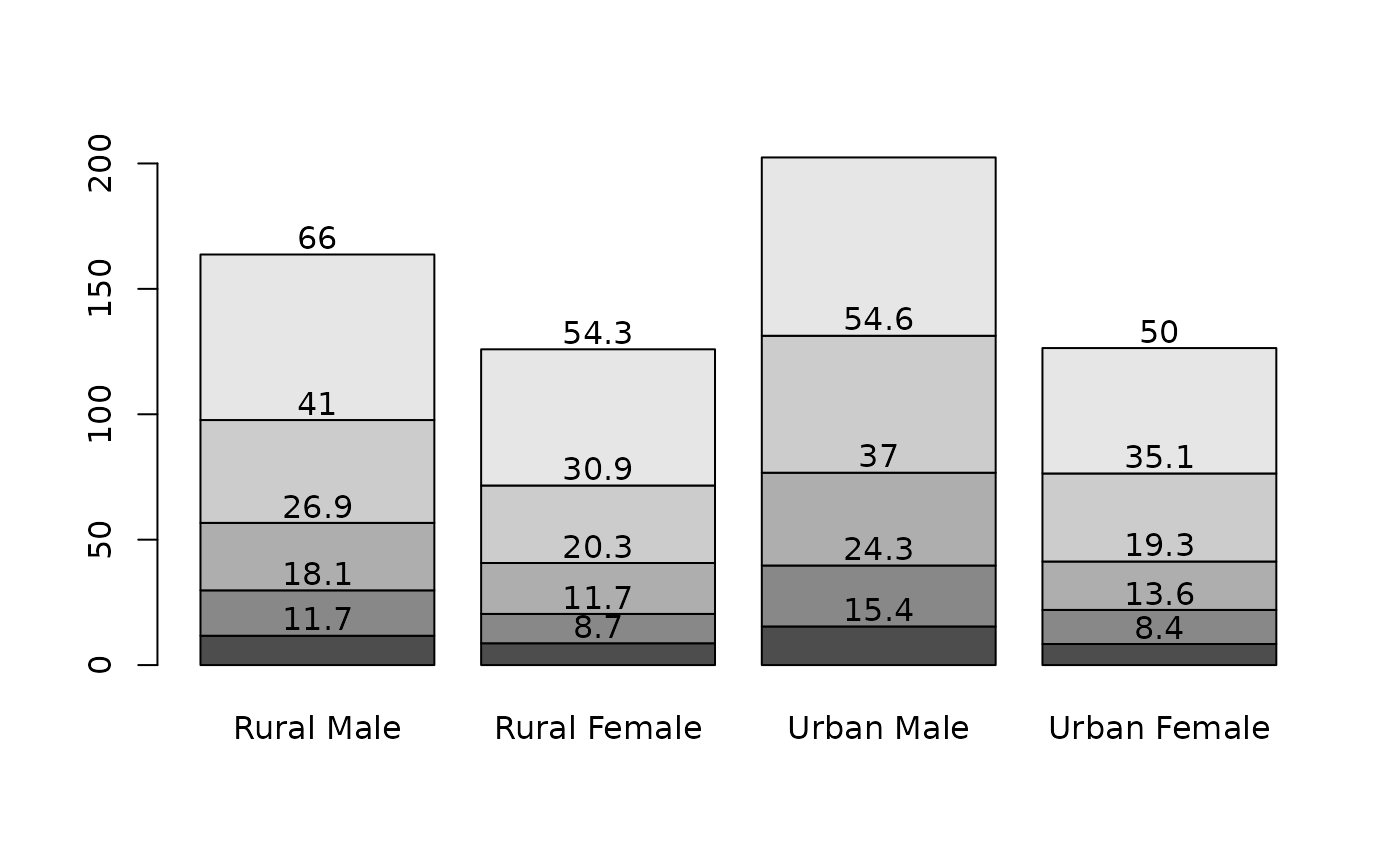 BarText(VADeaths, b=b, horiz = FALSE, beside = TRUE, cex=0.8)