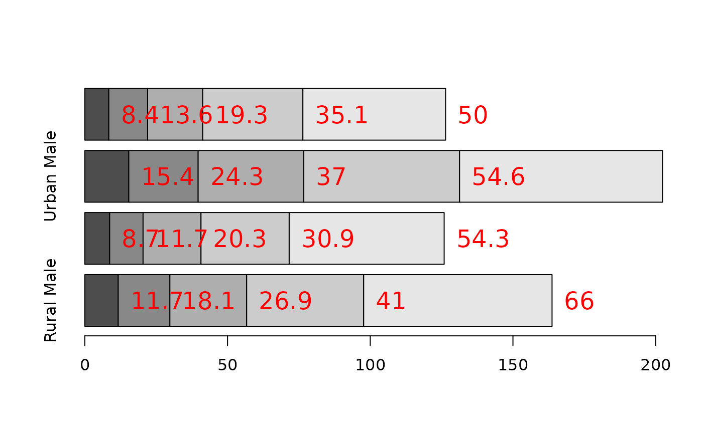 BarText(VADeaths, b=b, horiz = TRUE, col="red", cex=1.5)