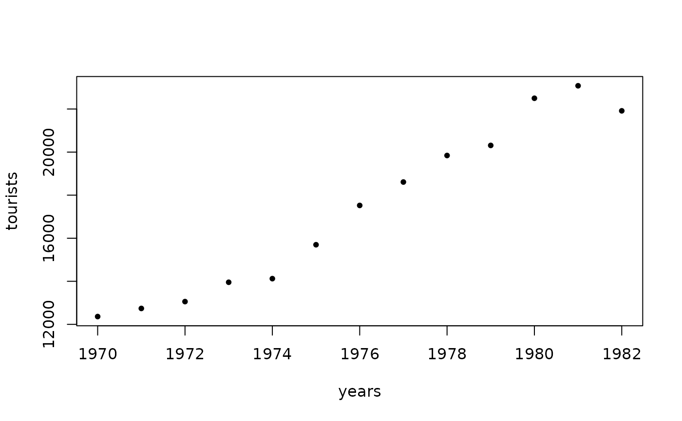 tourists <- c(12362, 12739, 13057, 13955, 14123, 15698, 17523, 18610, 19842,