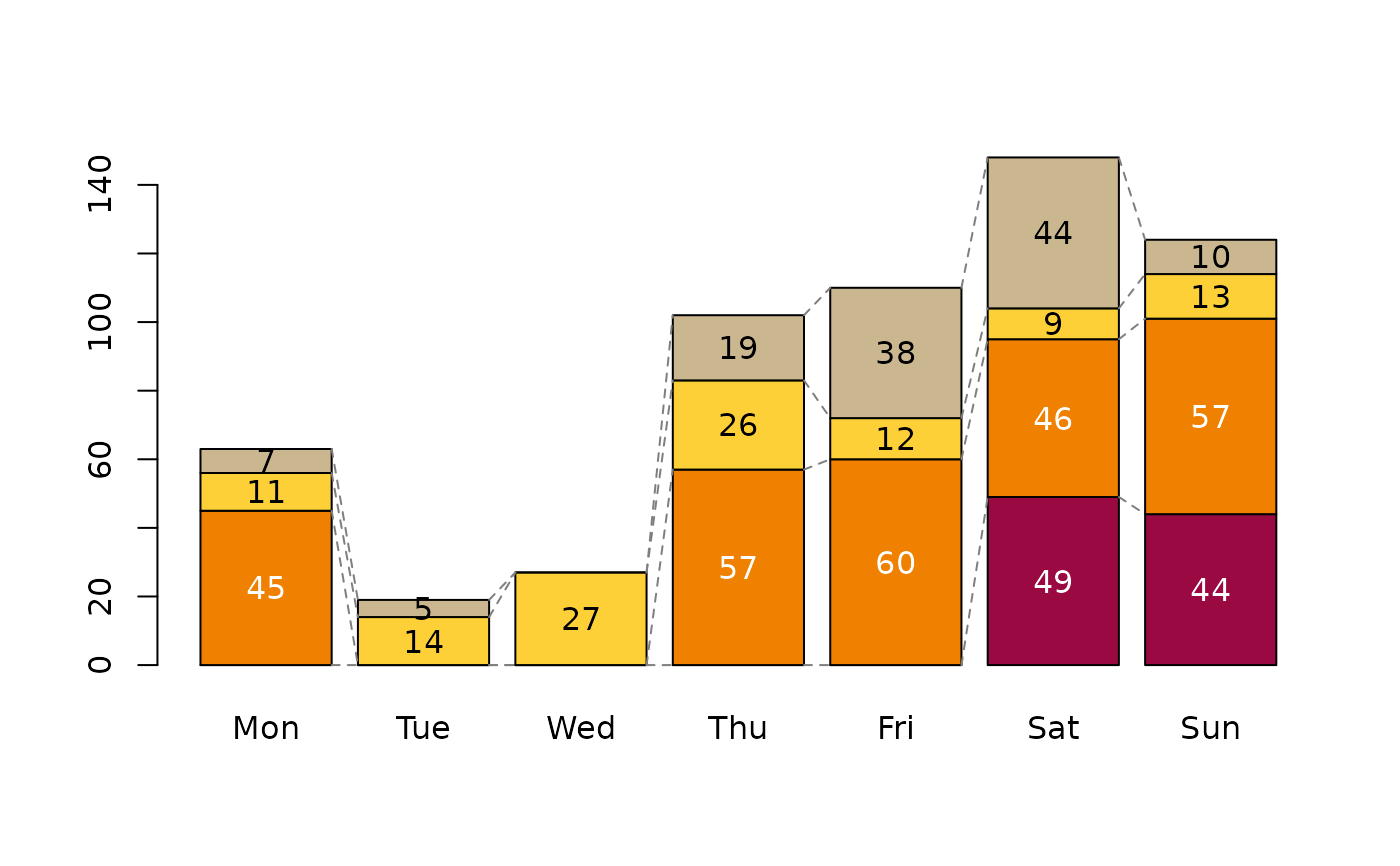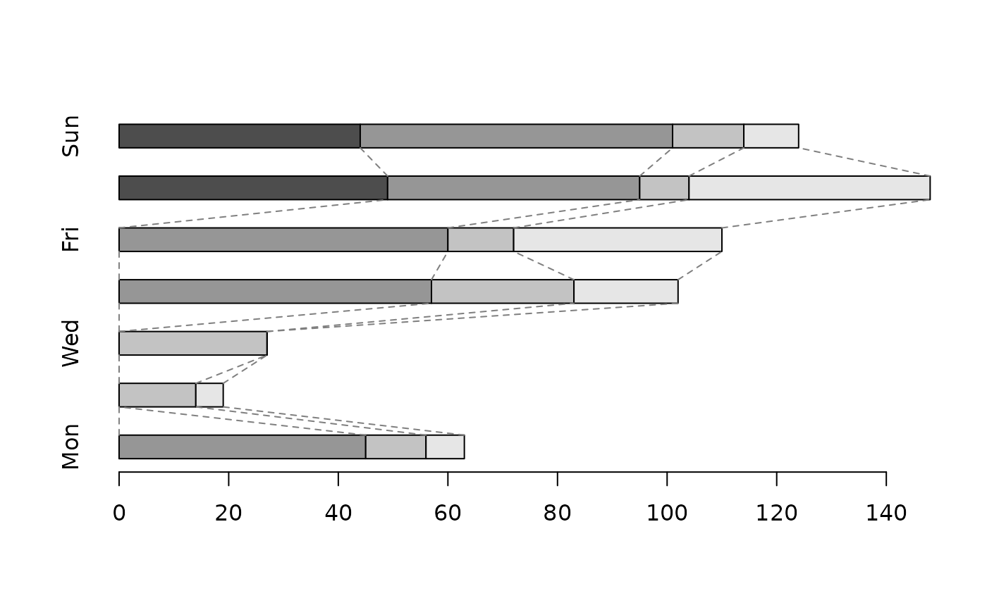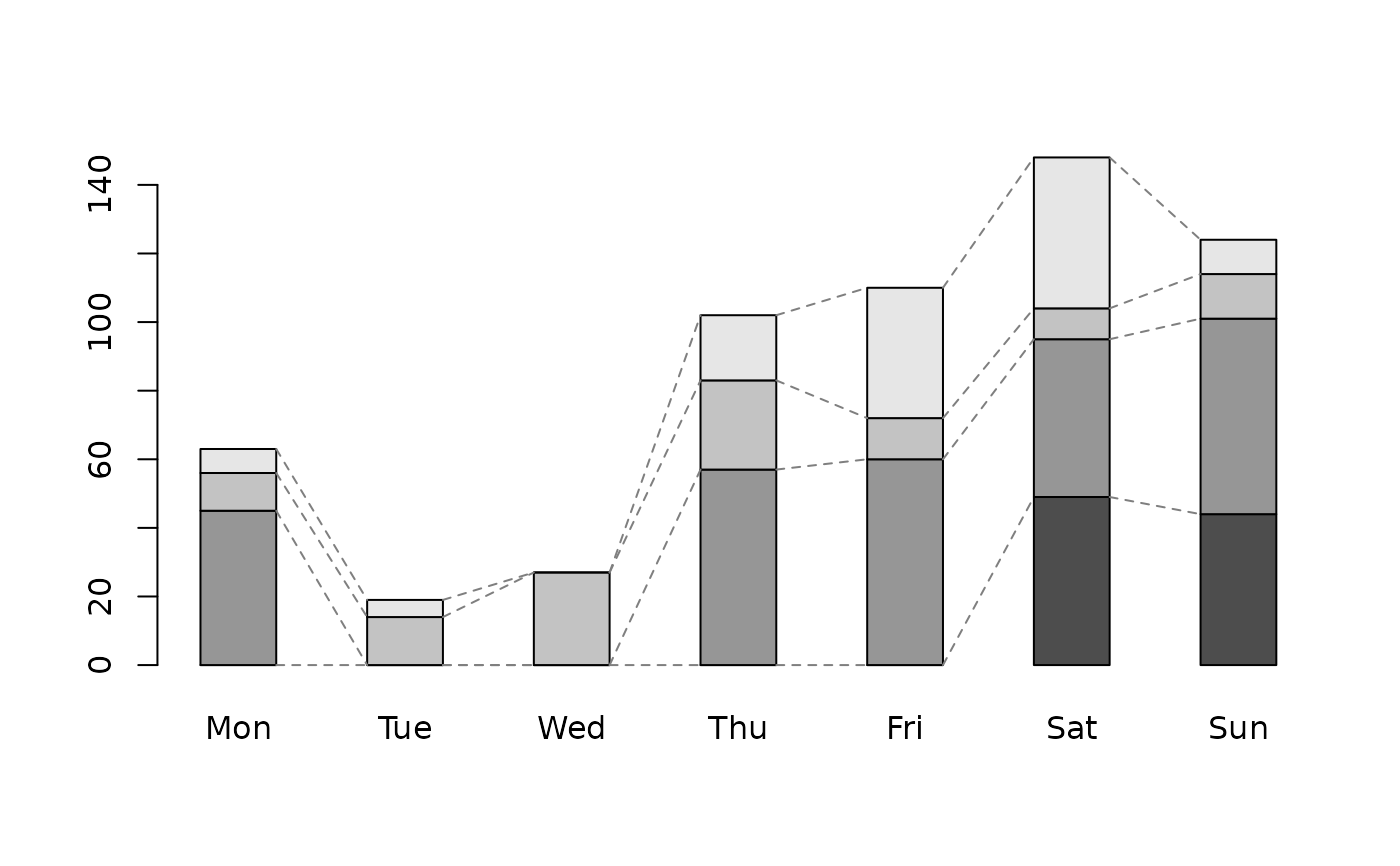 ConnLines(tab, beside=FALSE, space=1.2, col="grey50", lwd=1, lty=2, method="mid")