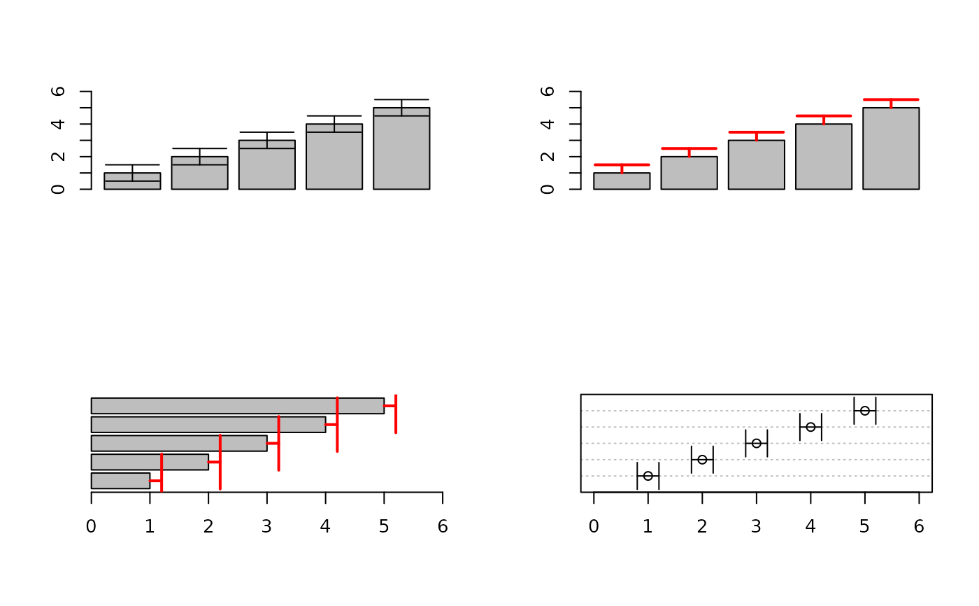 ErrBars(from=1:5, to=1:5+rep(0.2,5), pos=b, horiz=TRUE, length=0.2, col="red", code=2, lwd=2)
