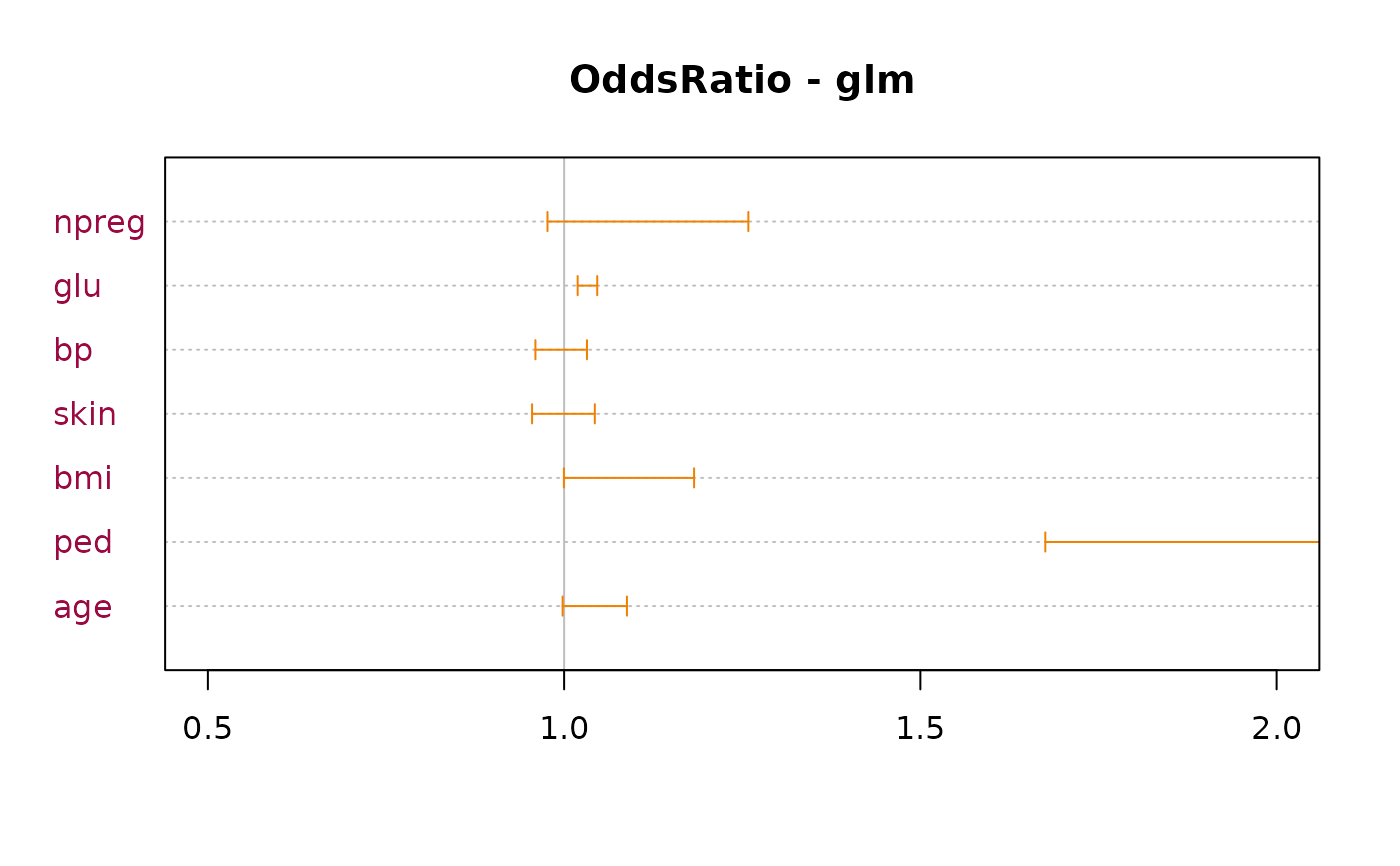 plot(OddsRatio(r.glm), xlim=c(0.5, 2), main="OddsRatio - glm", pch=NA,