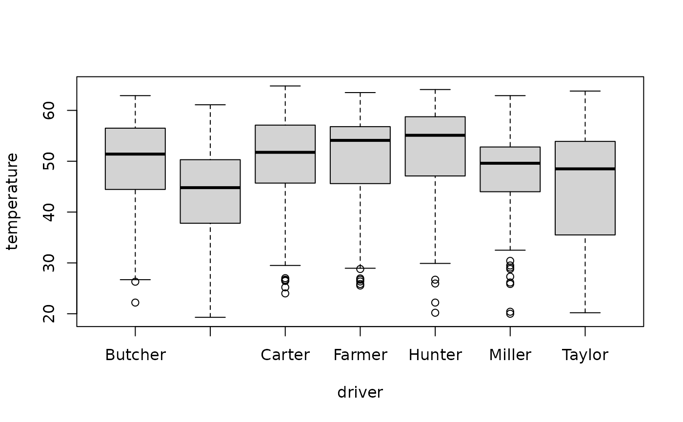 boxplot(temperature ~ driver, d.pizza)$out