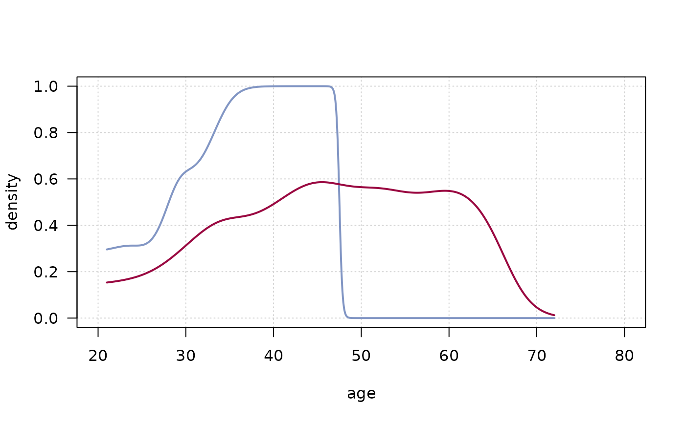 PlotConDens.RdPlot conditional densities by group. For describing how the conditional distribution of a categorical variable y changes over a numerical variable x we have the function cdplot. But if we want to compare multiple densities much work is required. PlotConDens allows to easily enter a grouping variable.