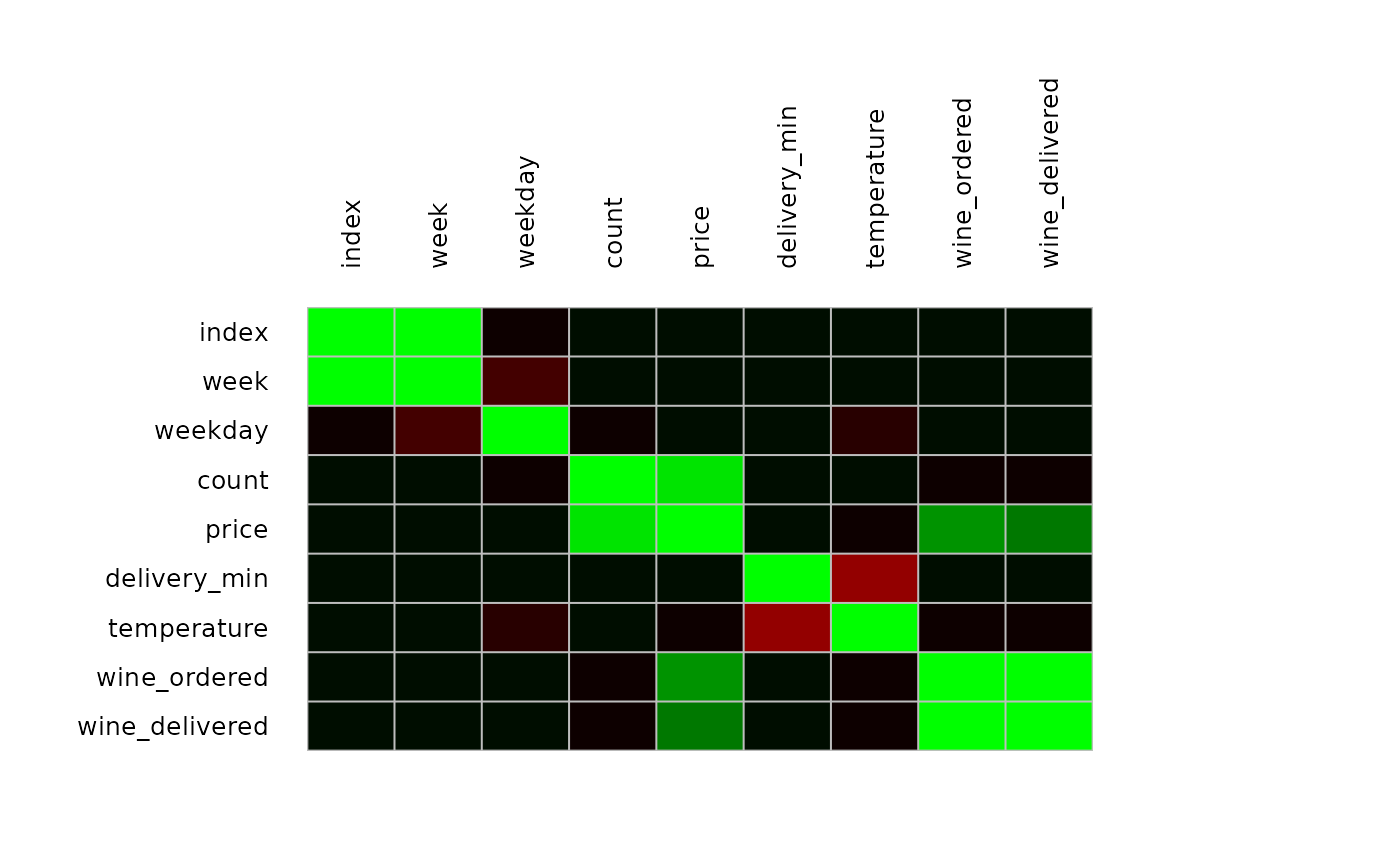 PlotCorr(m, cols=colorRampPalette(c("red", "black", "green"), space = "rgb")(20))