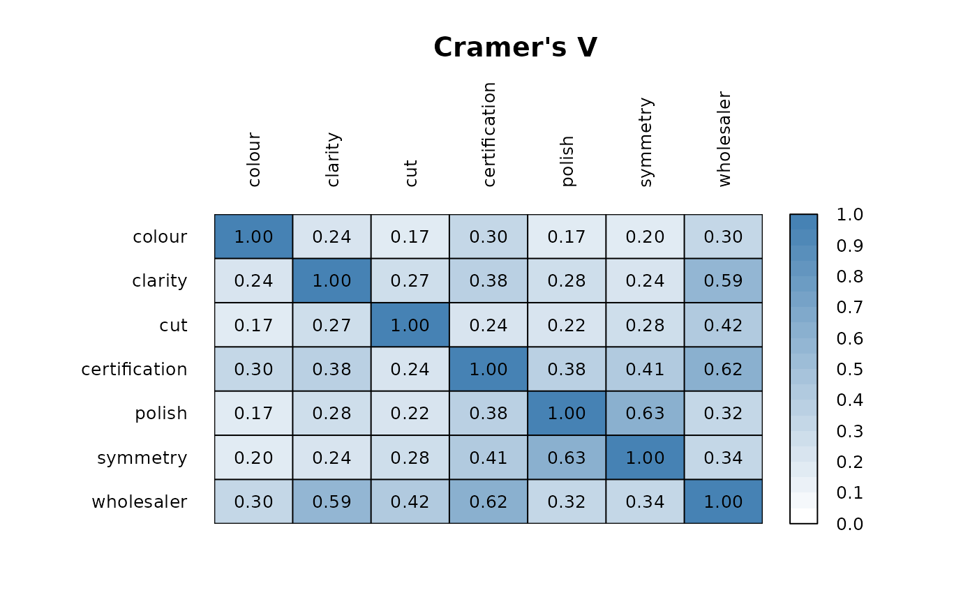 m <- PairApply(d.diamonds[, sapply(d.diamonds, is.factor)], CramerV, symmetric=TRUE)