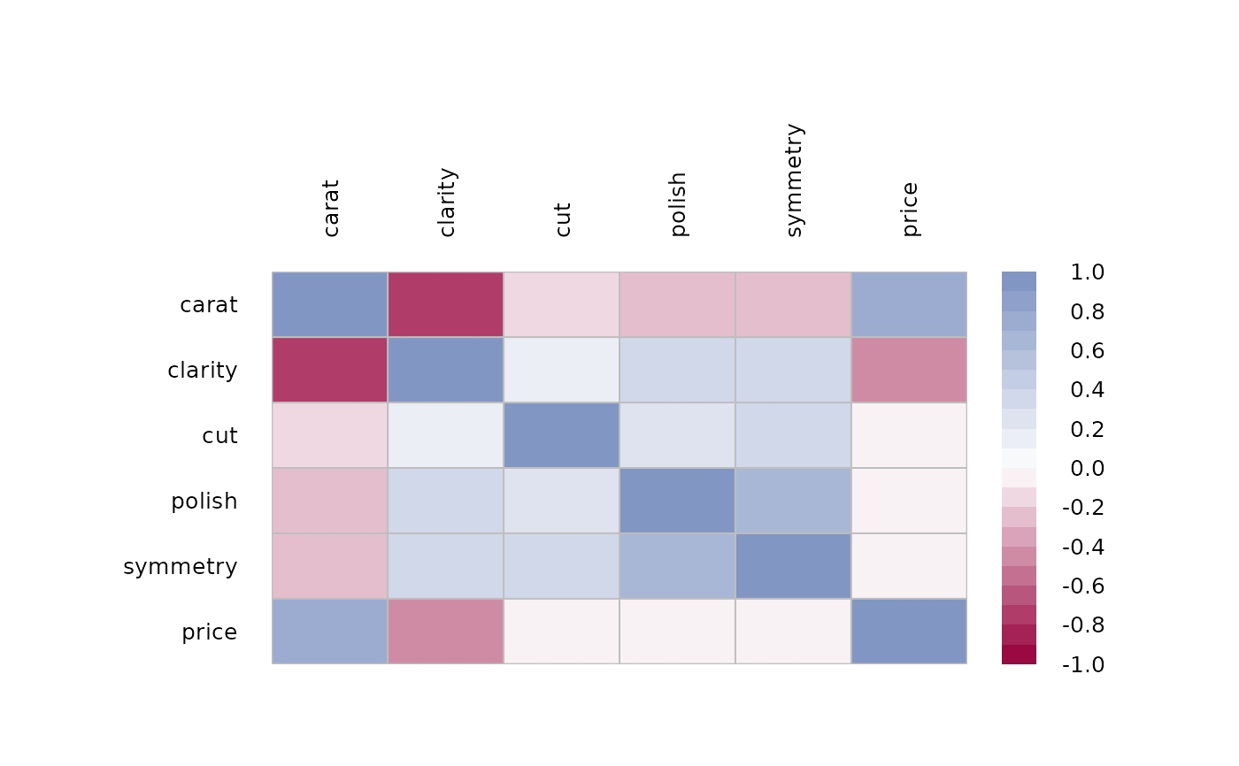 csp <- cor(data.frame(lapply(d.diamonds[,c("carat", "clarity", "cut", "polish",