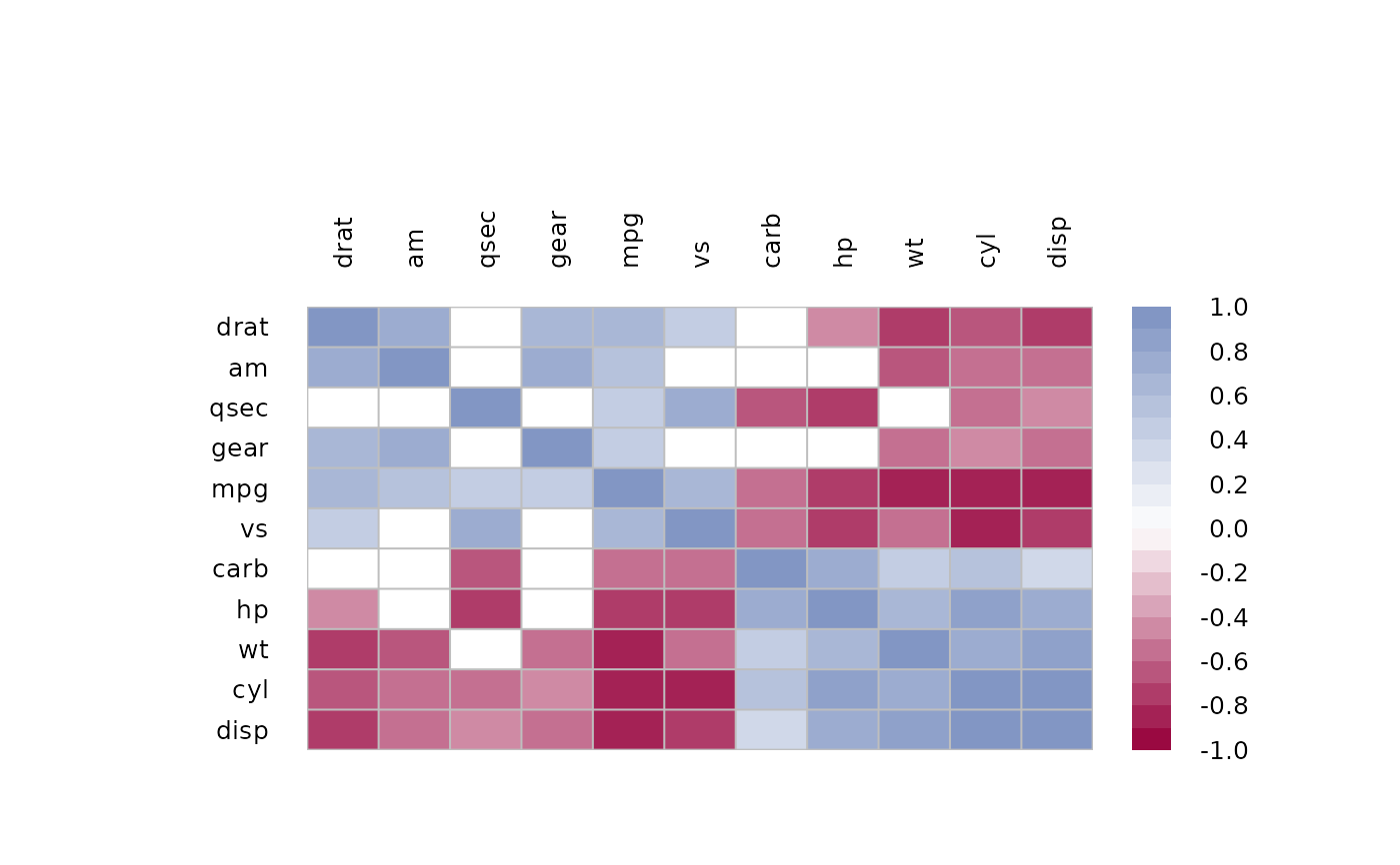 p <- PairApply(mtcars, function(x, y) cor.test(x, y)$p.value, symmetric=TRUE)