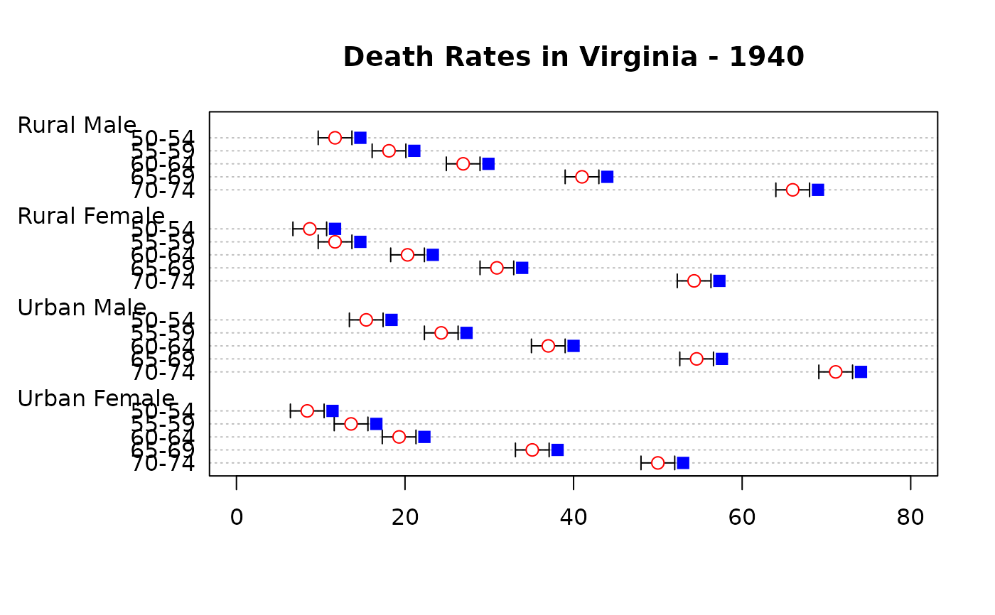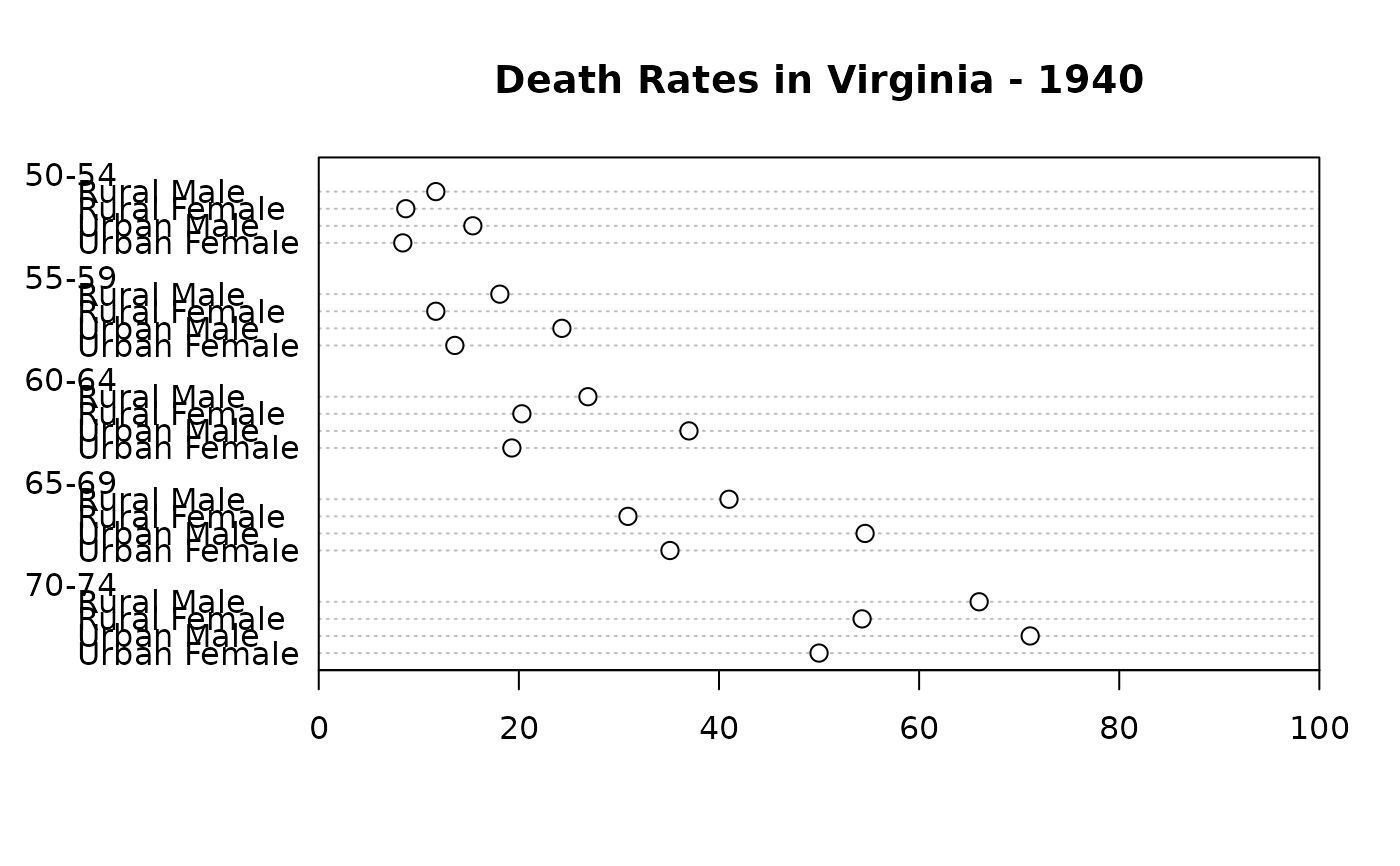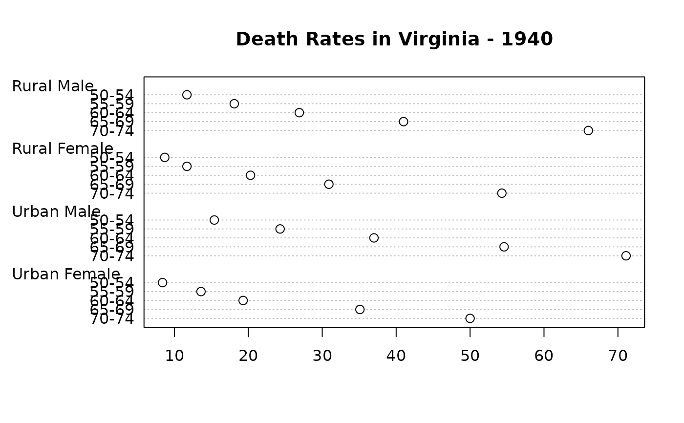 PlotDot(VADeaths, main = "Death Rates in Virginia - 1940")