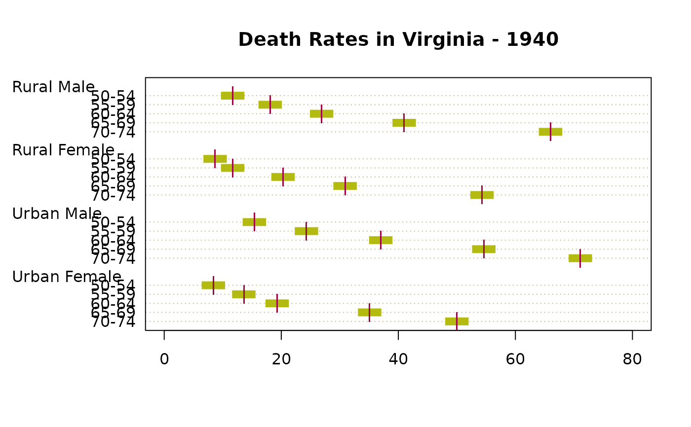 PlotDot(VADeaths, main="Death Rates in Virginia - 1940", pch="|",