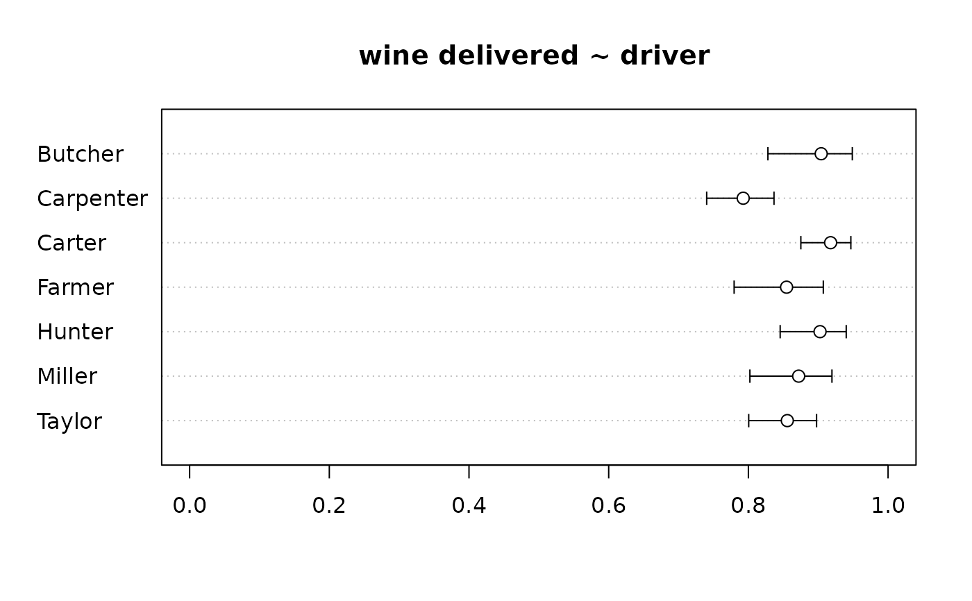 PlotDot(xci[,1], main="wine delivered ~ driver ", xlim=c(0,1),