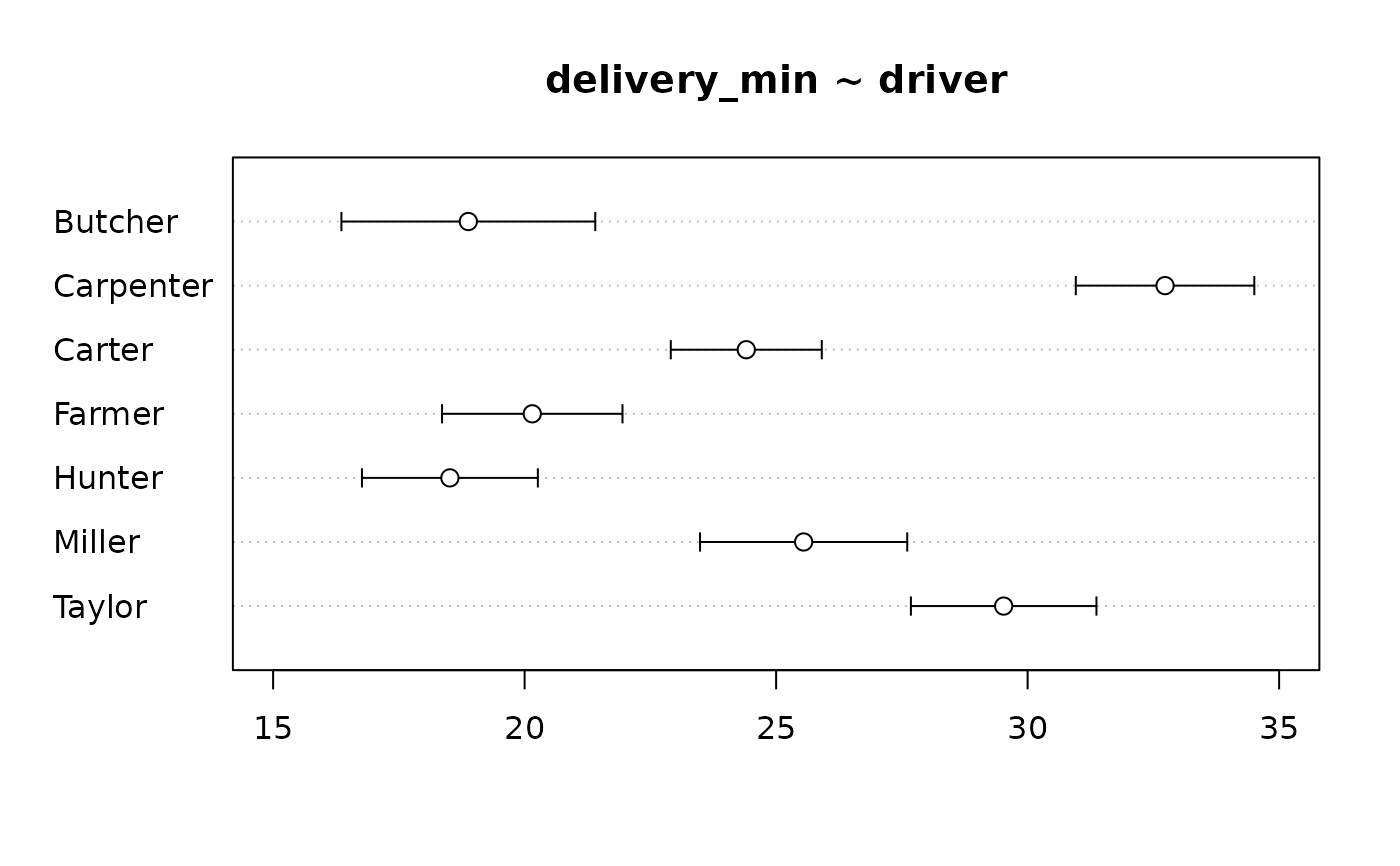 PlotDot(xci[, 1], main="delivery_min ~ driver", args.errbars=list(from=xci))