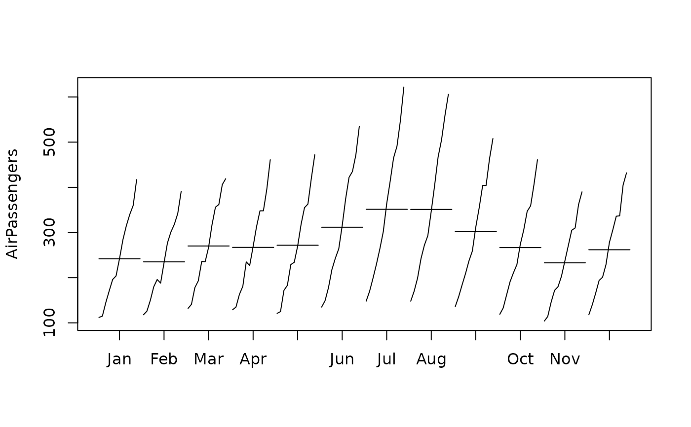 A cycle plot is a graphical method invented to study teh behaviour of a seasonal time series. The seasonal component of a univariate series is graphed. First the January values are graphed for successive years, then the February values and so forth. For each monthly subseries the mean of the values is portrayed by a horizontal line.