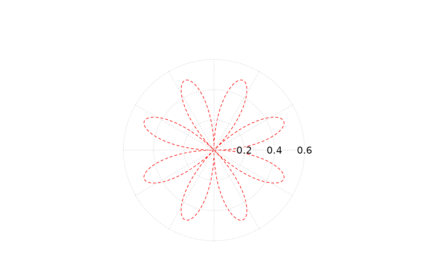 PlotPolar( r=sin(2*t)*cos(2*t), theta=t, type="l", lty="dashed", col="red" )