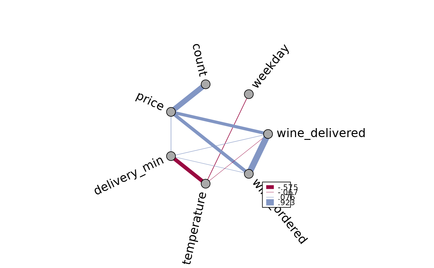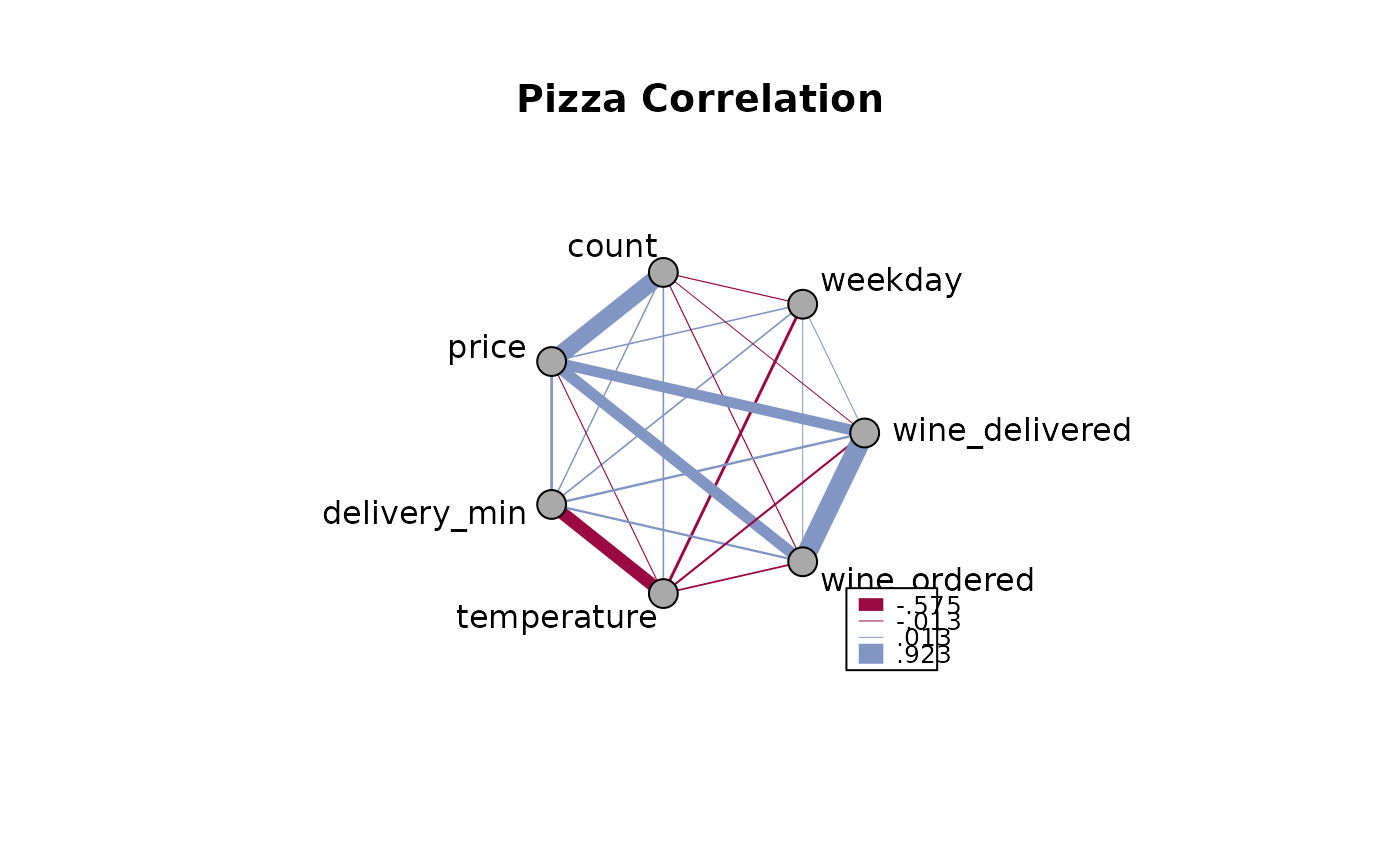 PlotWeb(m=m, col=c(DescTools::hred, DescTools::hblue), main="Pizza Correlation")