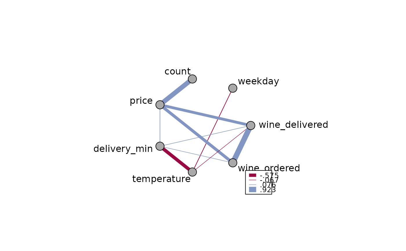 PlotWeb.RdThis plot can be used to graphically display a correlation matrix by using the linewidth between the nodes in proportion to the correlation of two variables. It will place the elements homogenously around a circle and draw connecting lines between the points.