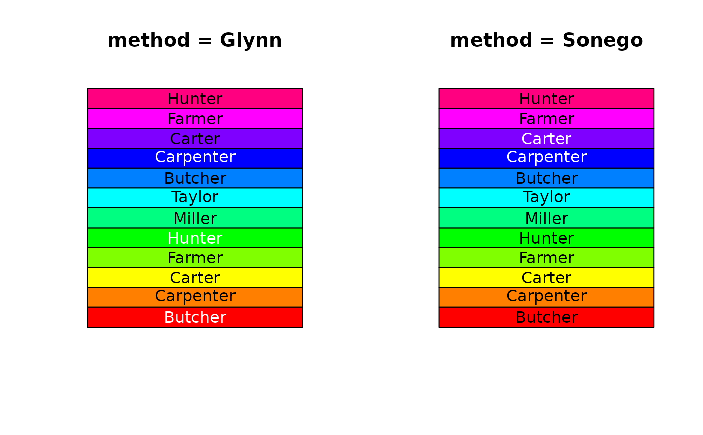 col=rainbow(12), ylab="", xlab="", axes=FALSE, main="method = Glynn" )