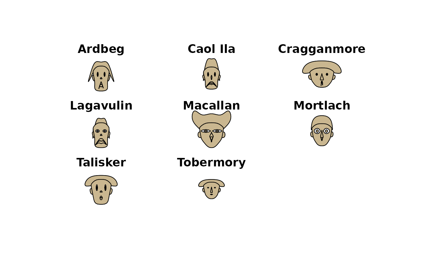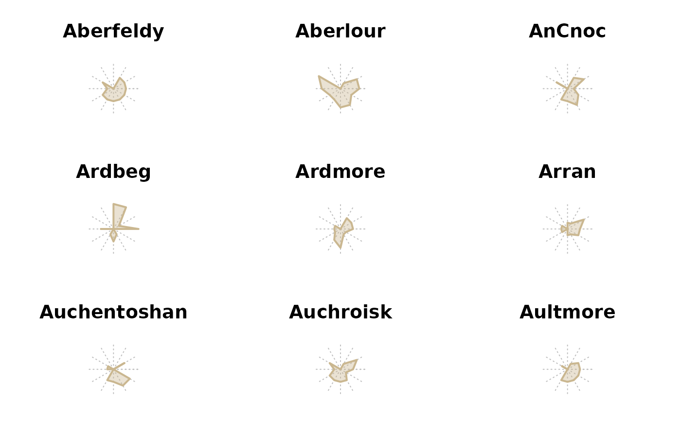 PlotFaces(d.whisky[id, 4:15], nr=3, nc=3, col=hecru, scale=TRUE, fill=TRUE,