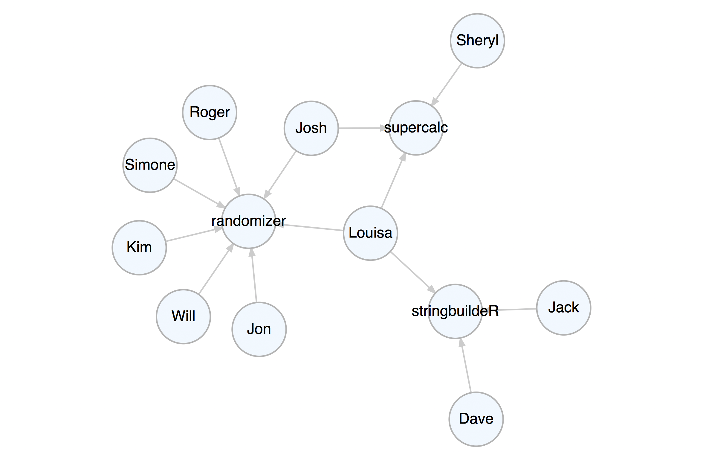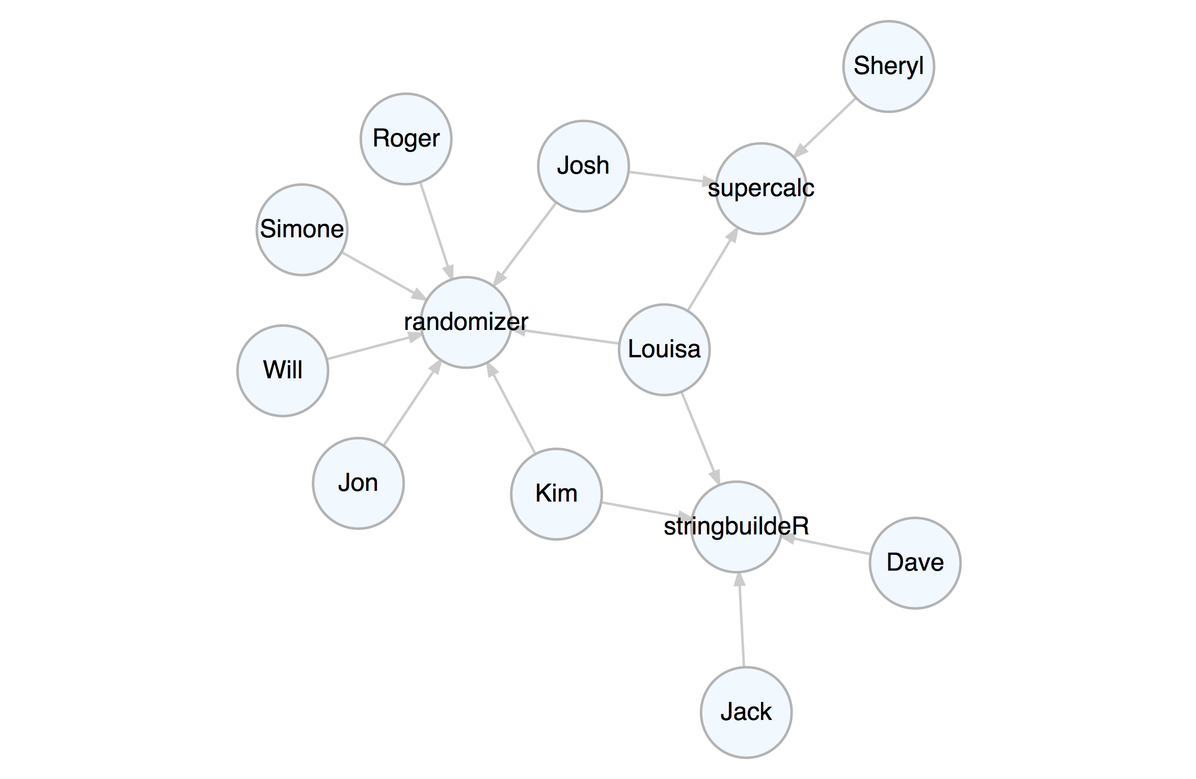That supercalc project is progressing quite nicely. Let’s get the total number of commits from all people to that most interesting project. Start by selecting that project’s node and work backwards. Traverse to the edges leading to it with trav_in_edge(). Those edges are from committers and they all contain the commits attribute with numerical values. Get a vector of commits and then get the sum (there are 1676 commits).