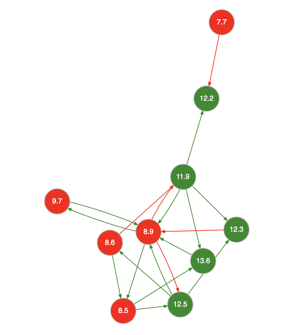 Now, because we have node/edge metadata (categorical labels and numerical data in value_1 & value_2 for both nodes and edges), we can do some interesting things with the graph. First, let’s do some mutation with mutate_node_attrs() and mutate_edge_attrs() and get the sums of value_1 and value_2 as value_3 (for both the nodes and the edges). Then, let’s color the nodes and edges forestgreen if value_3 is greater than 10 (red otherwise). Finally, let’s display the values of value_3 for the nodes when rendering the graph diagram. Here we go!