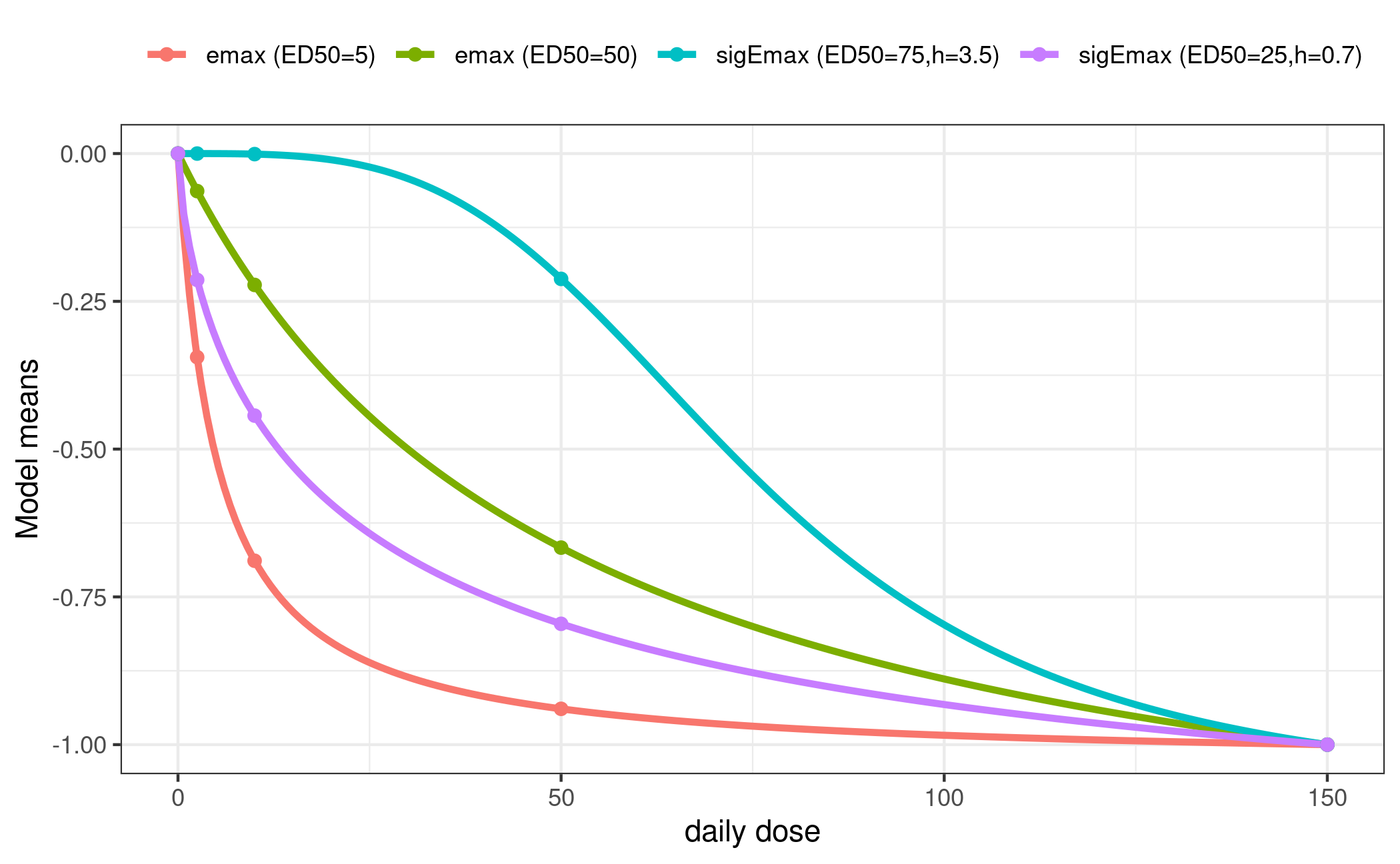 One could also assume further parameters to be common across regimen (for example the Emax or the ED50 parameter for the Emax model), but in the following example no such assumption is made.