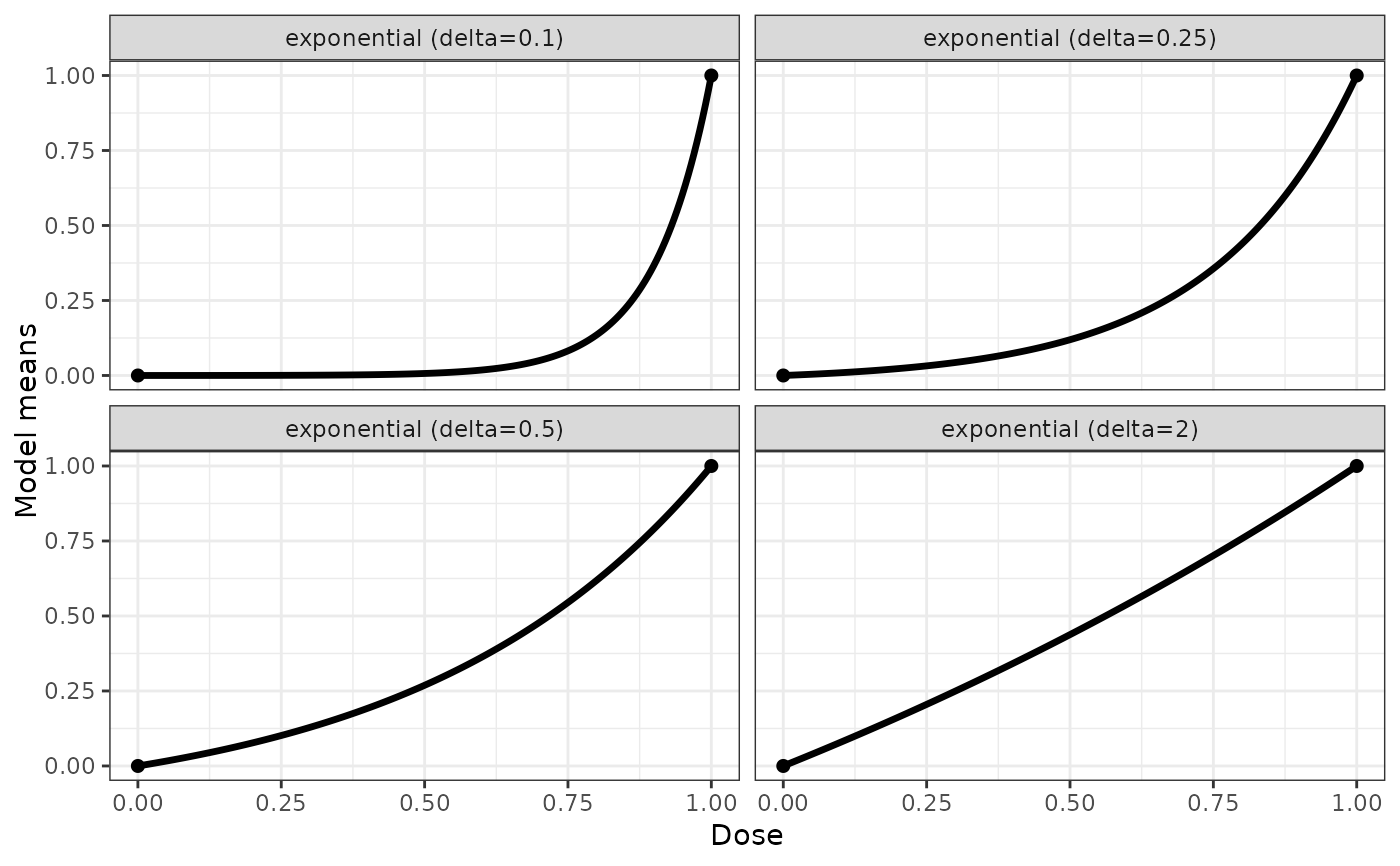 expoModList <- Mods(exponential = c(0.1,0.25,0.5,2), doses=c(0,1))
