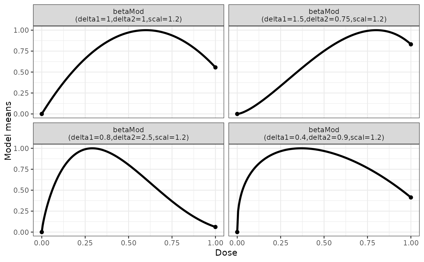 The beta model is intended to capture non-monotone dose-response relationships and is more flexible than the quadratic model. The kernel of the beta model function consists of the kernel of the density function of a beta distribution on the interval [0,scal]. The parameter scal is not estimated but needs to be set to a value larger than the maximum dose. It can be set in most functions (fitMod, Mods) via the addArgs argument, when omitted a value of 1.2*(maximum dose) is used as default, where the maximum dose is inferred from other input to the respective function.