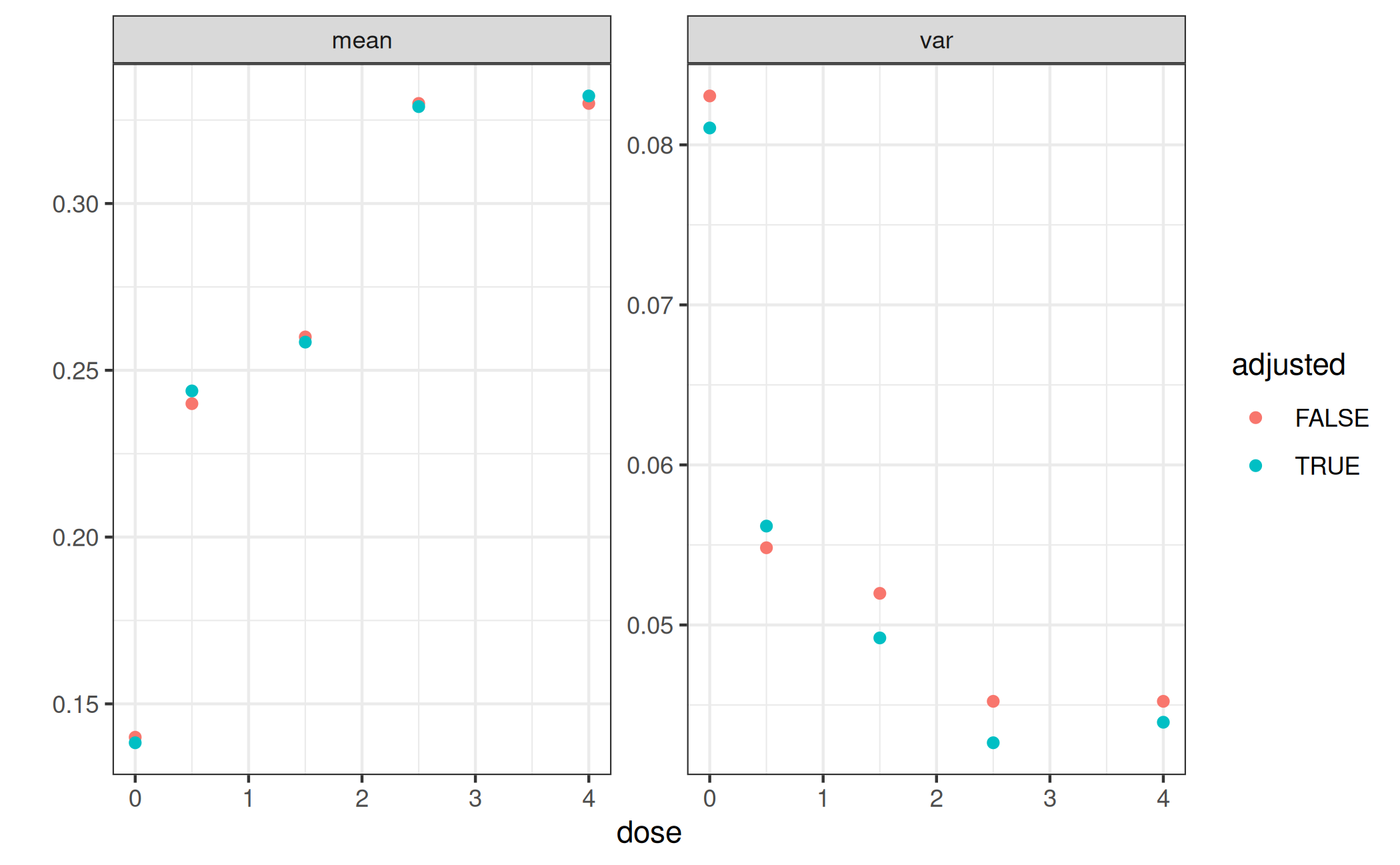 ca <- covariate_adjusted_estimates(coef(fit_cov), vcov(fit_cov), ~factor(dose)+0+x1+x2,
