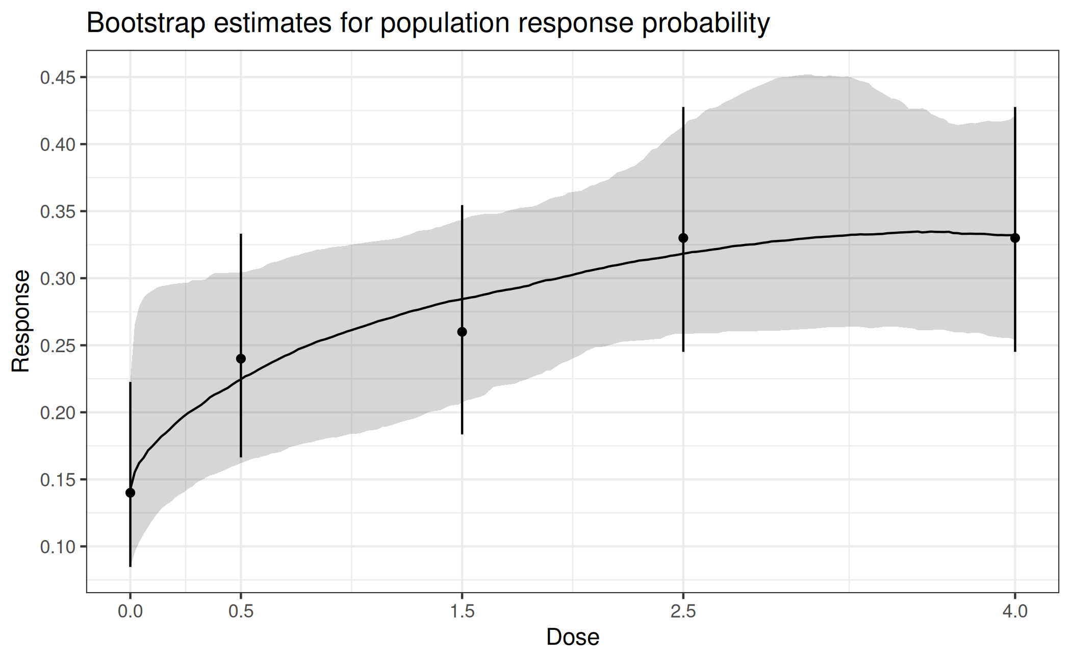 Dose-response modeling then can proceed with a combination of bootstrapping and model averaging. For detailed explanations refer to the vignette for analysis of continuous data. Fitting is done on the logit scale, for plotting transfer the fit back to the probability scale.
