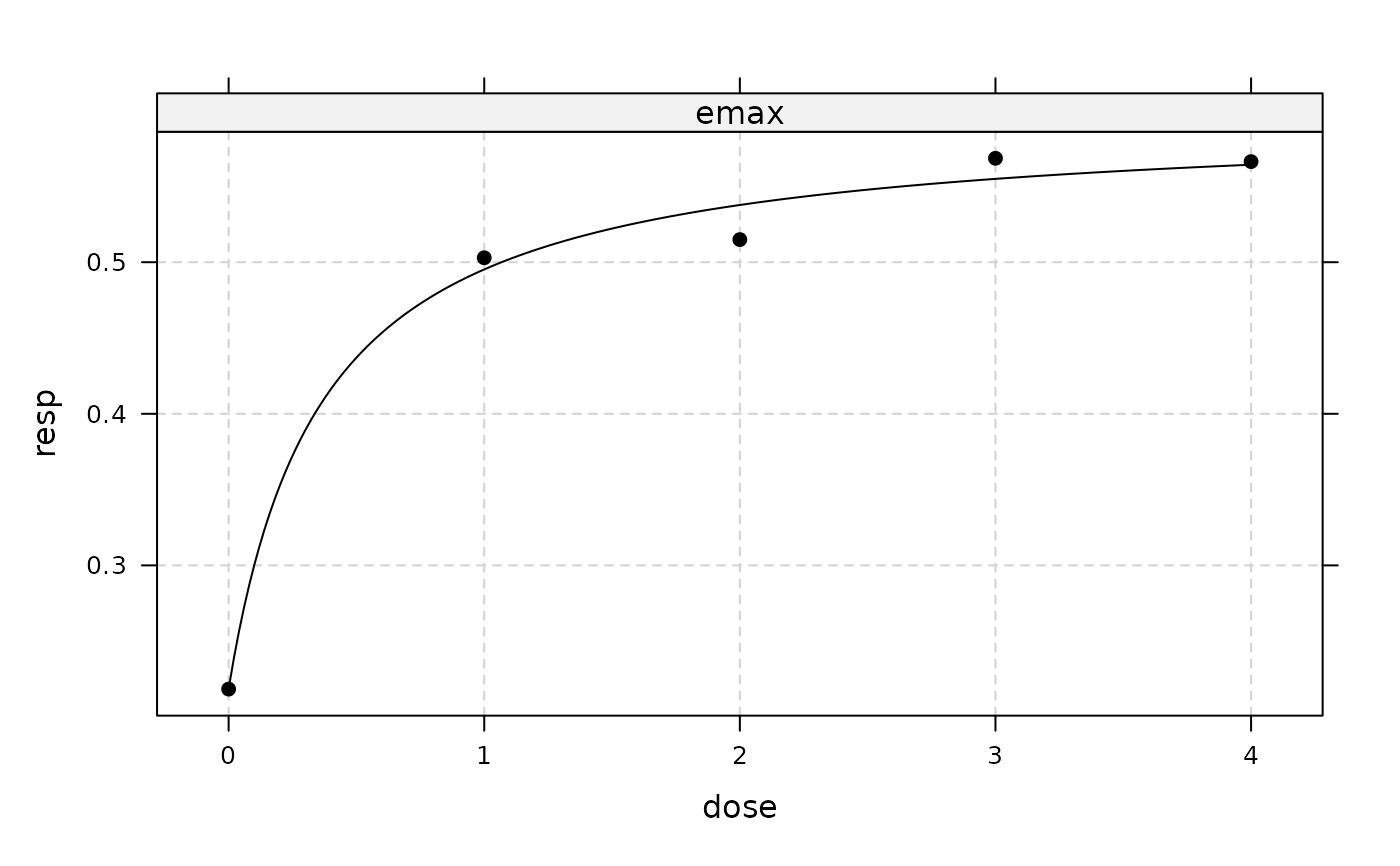 Fits a dose-response model. Built-in dose-response models are "linlog", "linear", "quadratic", "emax", "exponential",